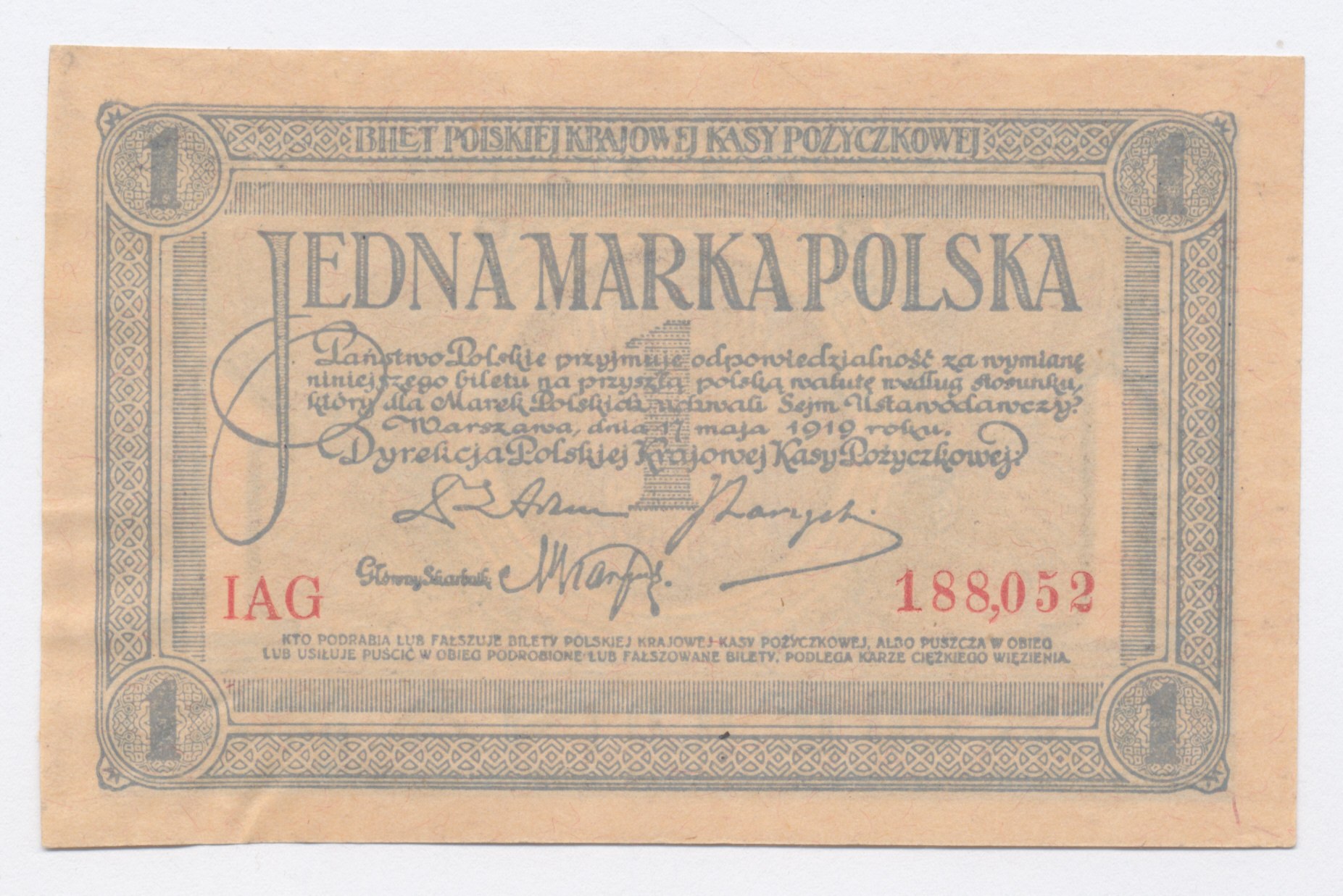 II RP, 1 mkp 1919 IAG. Znak wodny - plastry poziome. Stan zachowania 2+. Banknot bez łamań ale mocne zafalowania oraz zgniotki. Literatura: Miłczak 19b