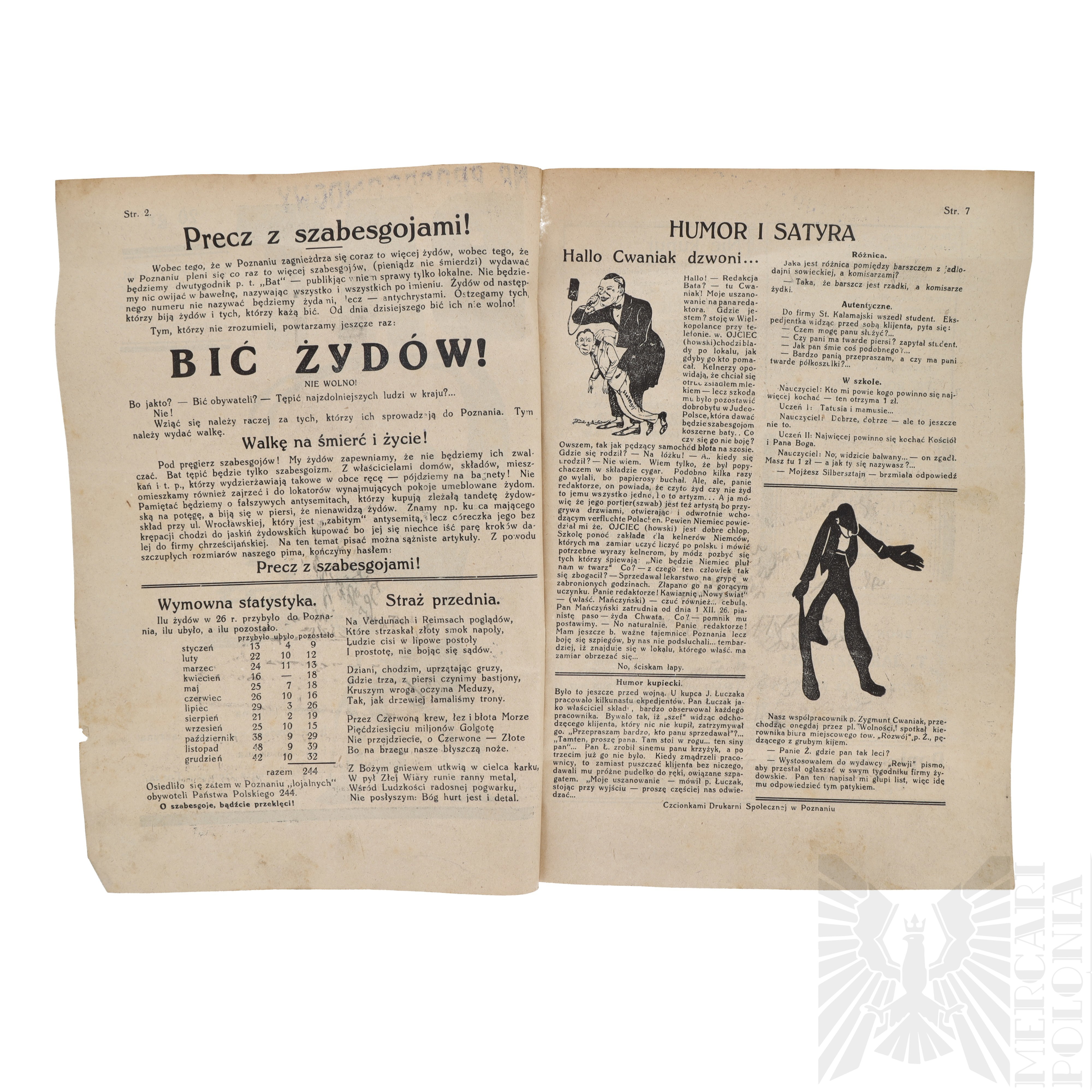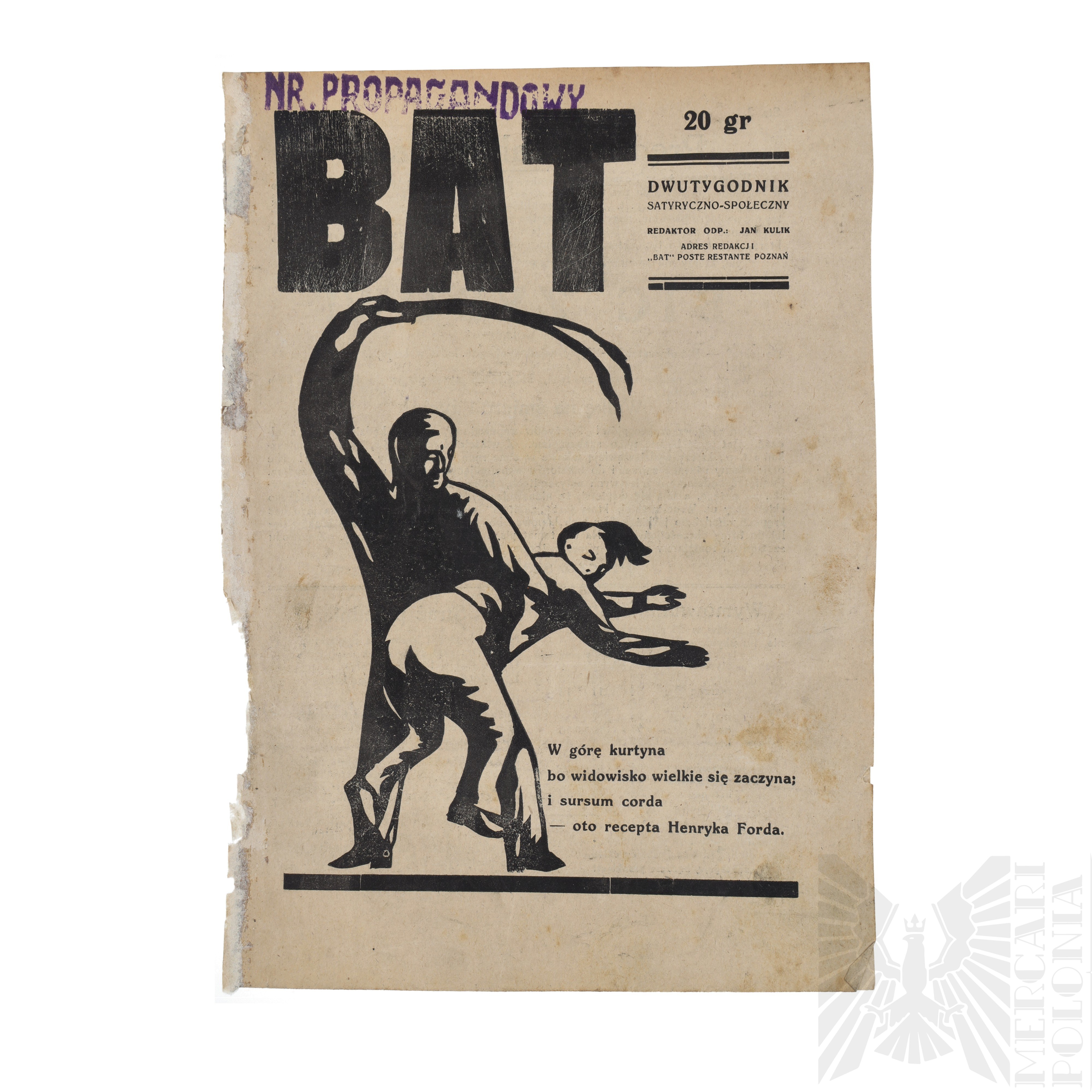 Wobec tego, że w Poznaniu zagnieżdrza się coraz to więcej żydów, wobec tego, że w Poznaniu pleni się co raz to więcej szabesgojów, (pieniądz nie śmierdzi) wydawać będziemy dwutygodnik p. t. „Bat" publikjąc wniem sprawy tylko lokalne. Nie będziemy nic owijać w bawełnę, nazywając wszystko i wszystkich po imieniu. Żydów od następnego numeru nie nazywać będziemy żydami, lecz - antychrystami. Ostrzegamy tych którzy biją żydów i tych, którzy każą bić. Od dnia dzisiejszego bić ich nie wolno!