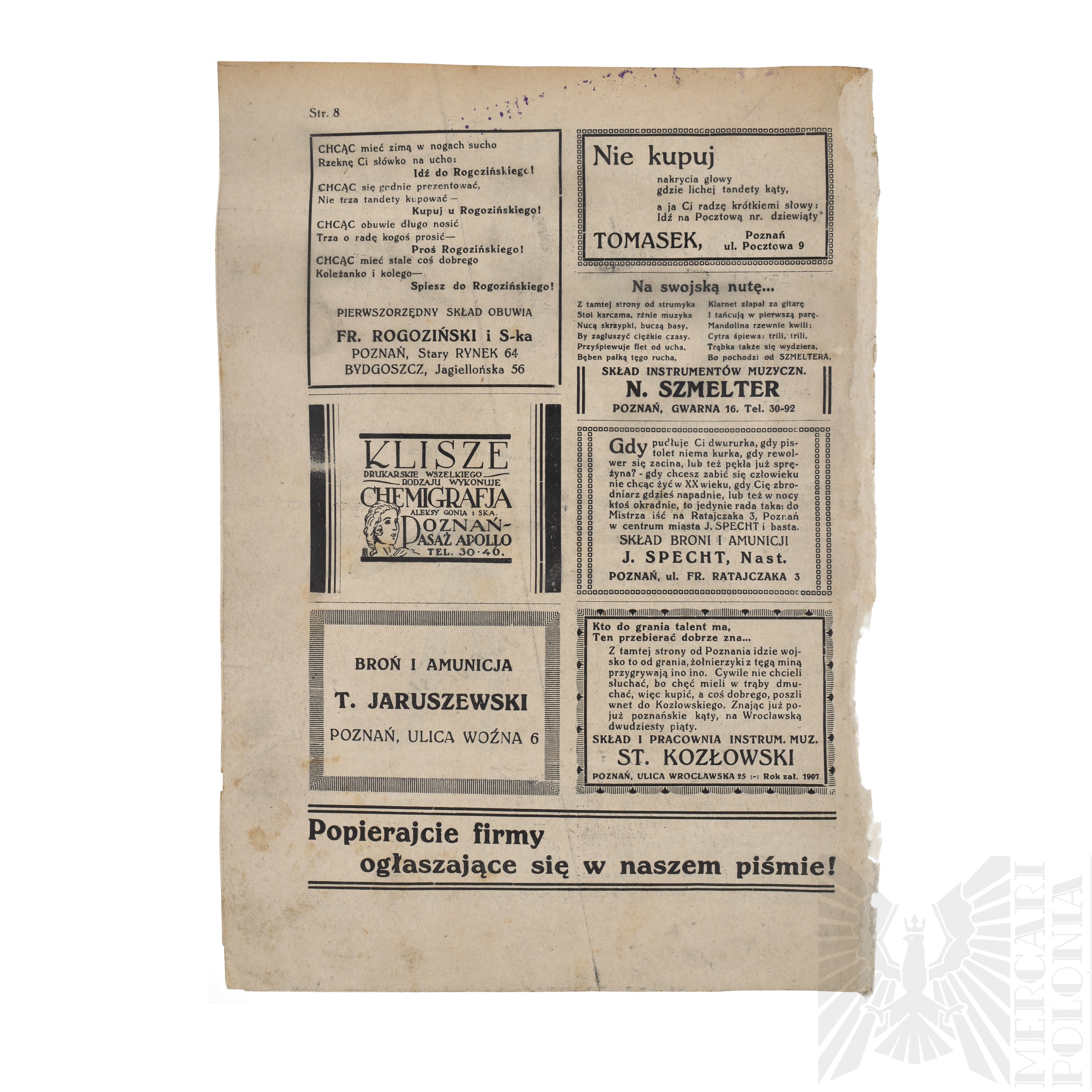 Pod pręgierz szabesgojów! My żydów zapewniamy, że nie będziemy ich zwalczać. Bat tępić będzie tylko szabesgoizm. Z właścicielami domów, składów, mieszkań i. t. p., którzy wydzierżawiają takowe w obce ręcę - pójdziemy na bagnety! Nie omieszkamy również zajrzeć i do lokatorów wynajmujących pokoje umeblowane żydom. Pamiętać będziemy o fałszywych antysemitach, którzy kupują zleżałą tandetę żydowską na potęgę, a biją się w piersi, że nienawidzą żydów. Znamy np. kupca mającego skład przy ul. Wrocławskiej, który jest "zabitym" antysemitą, lecz córeczka jego bez krępacji chodzi do jaskiń żydowskich kupować bo jej się niechce iść parę kroków dalej do firmy chrześcijańskiej. Na ten temat pisać można sążniste artykuły. Z powodu szczupłych rozmiarów naszego pisma, kończymy hasłem: