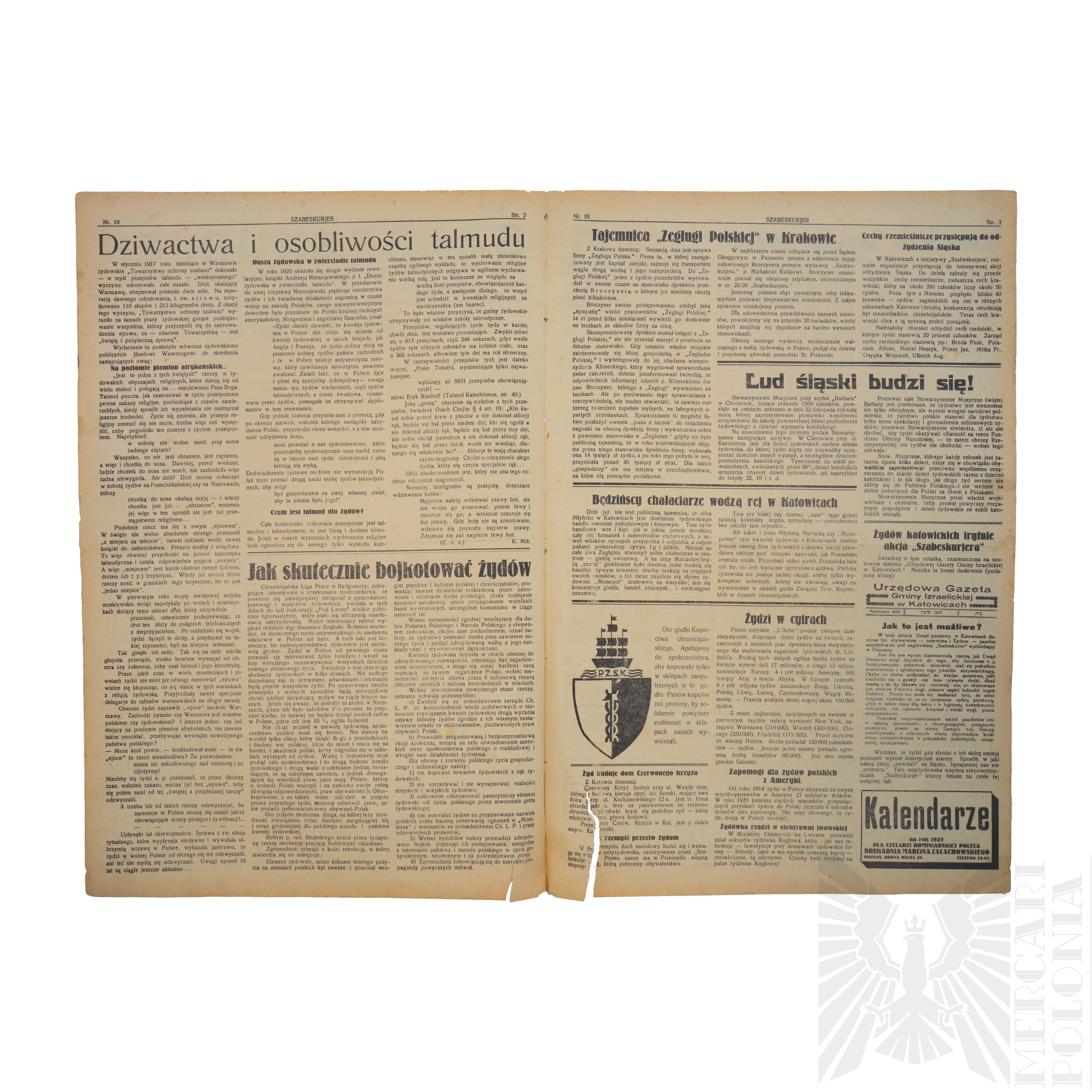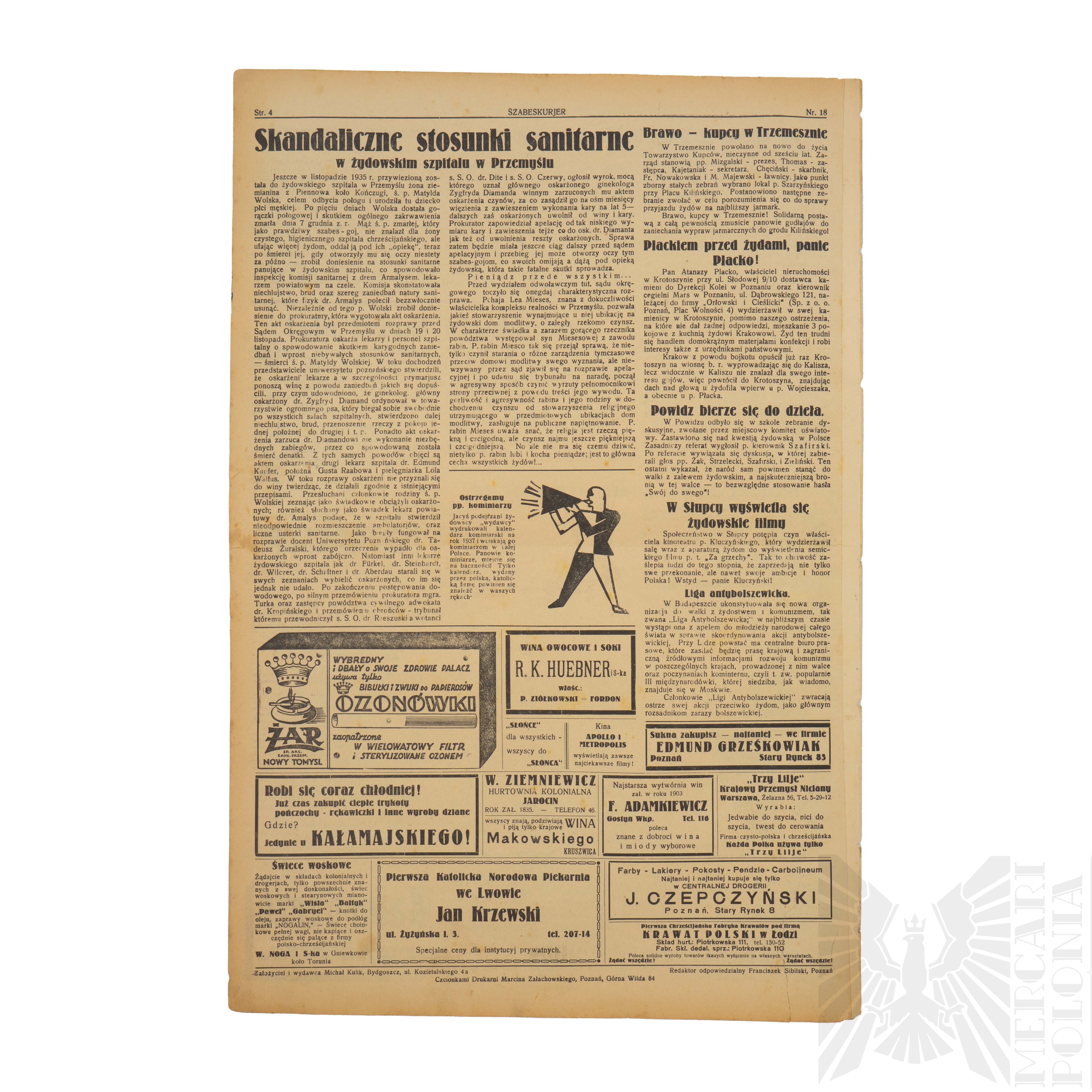 Antysemicki tygodnik ilustrowany “SZABES KURJER” numer 18 wydany w Poznaniu w październiku 1935 roku.
