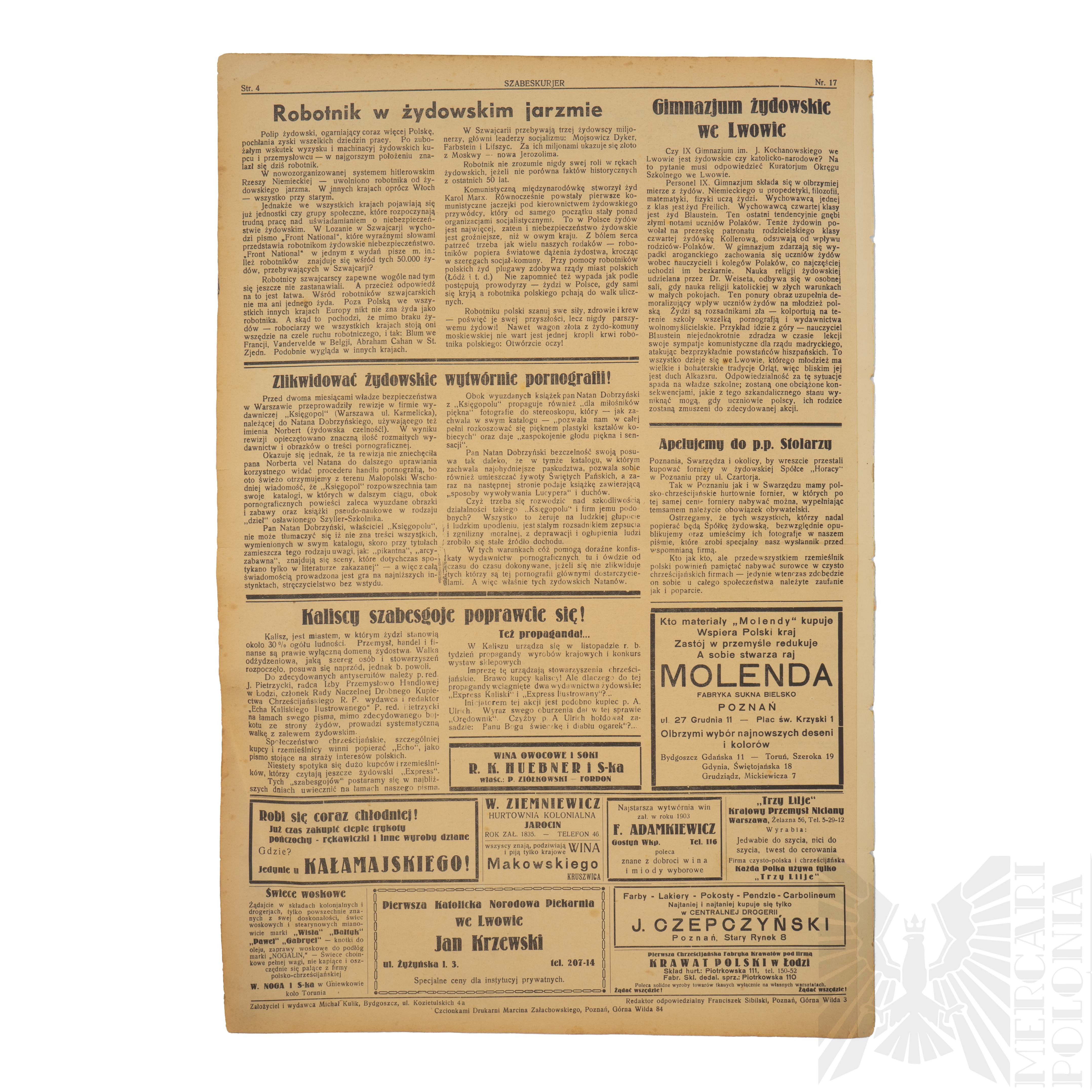 Antysemicki tygodnik ilustrowany “SZABES KURJER” numer 22 wydany w Poznaniu w październiku 1935 roku.