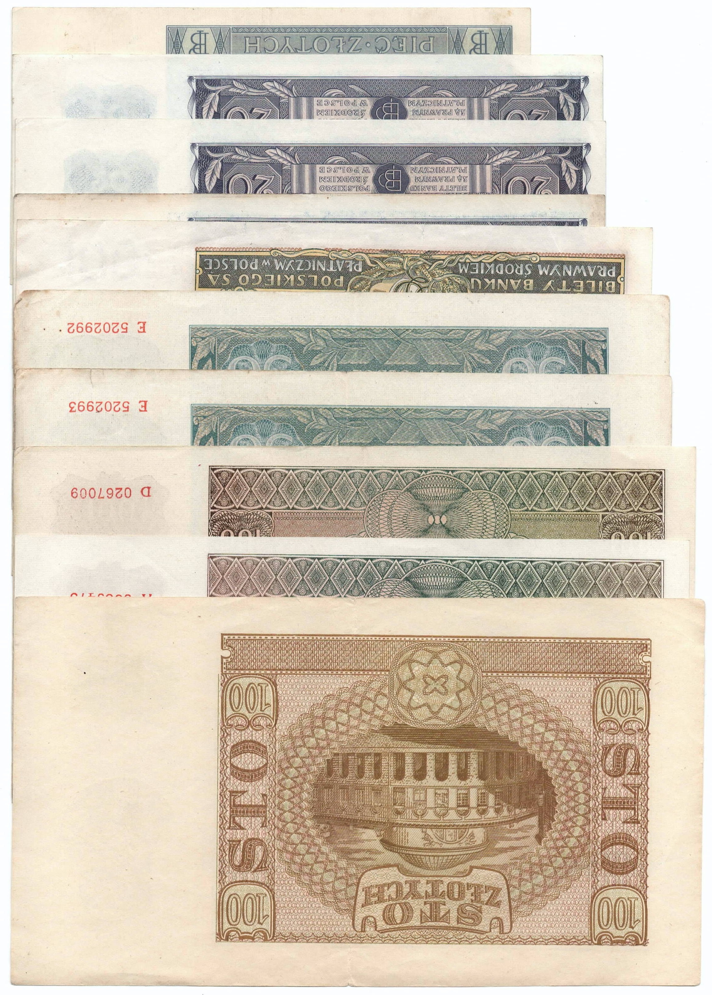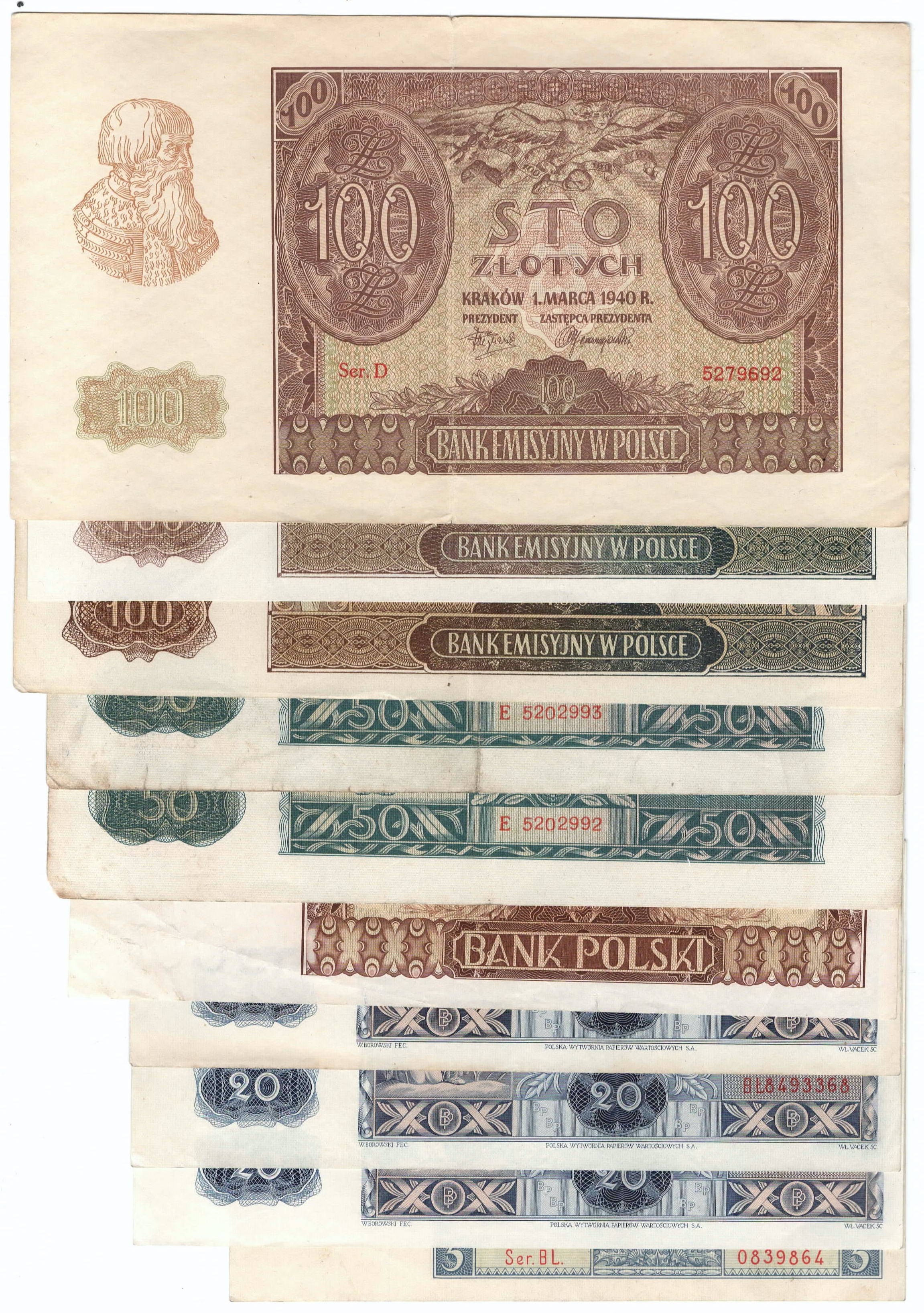 Zestaw 10 banknotów w różnym stanie zachowania.