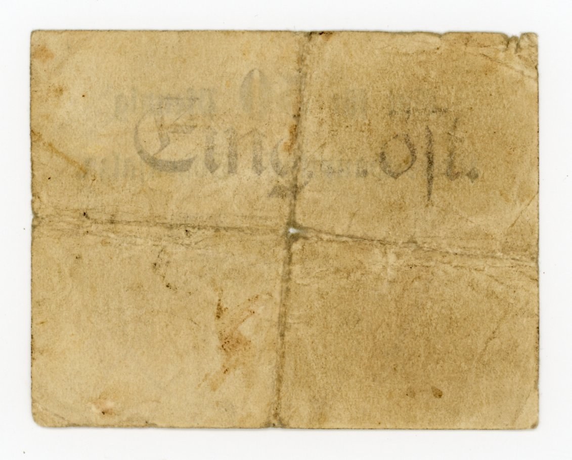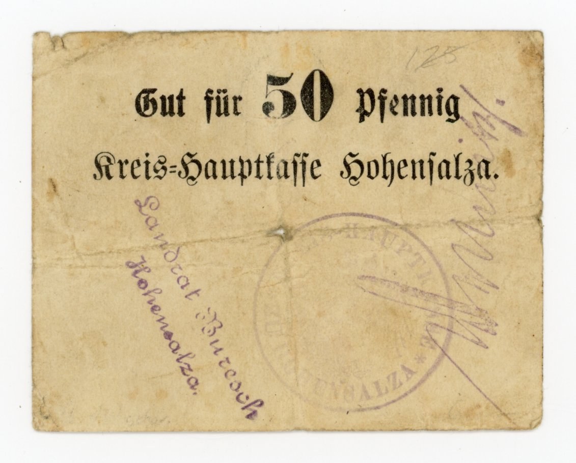 Inowrocław/Hohensalza 50 fenigów (1914). Cyfra 5 niska. Stan zachowania 4. Niewielkie przetarcie na środku banknotu.