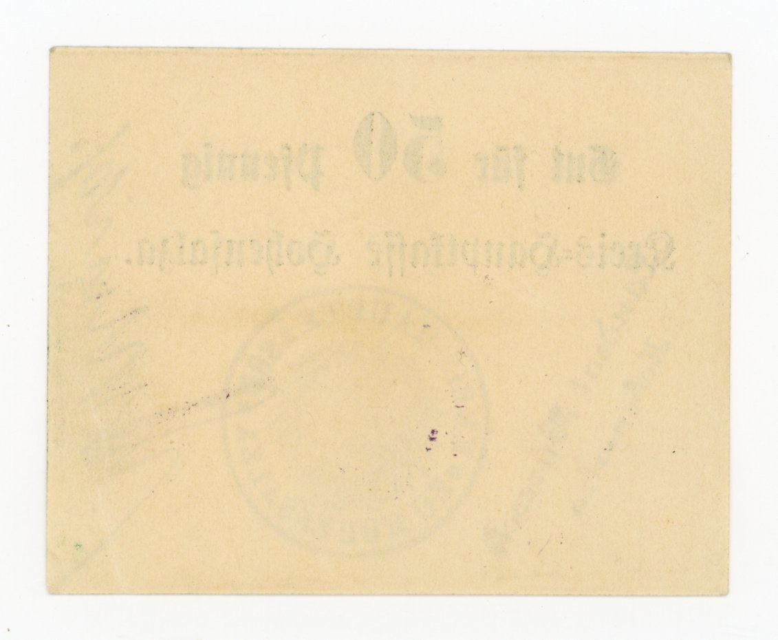 Inowrocław/Hohensalza 50 fenigów (1914). Cyfra 5 wysoka. Stan zachowania 1-. Niewielkie przetarcie na środku banknotu.