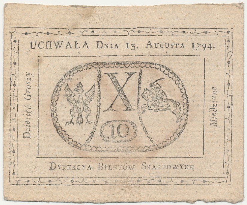 Bez złamań, ale ślad zalania w lewym górnym rogu, niewielkie przybrudzenia. Pod światło prześwitująca dziurka nad lewym skrzydłem orła