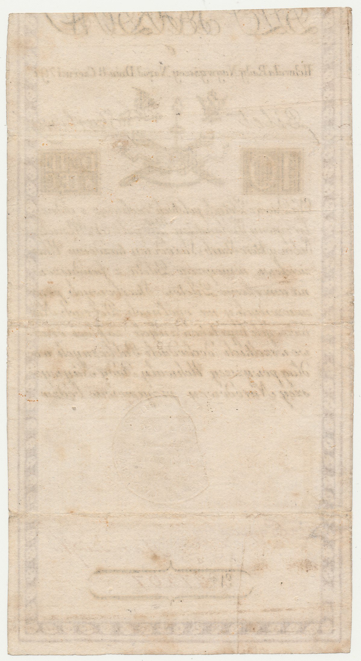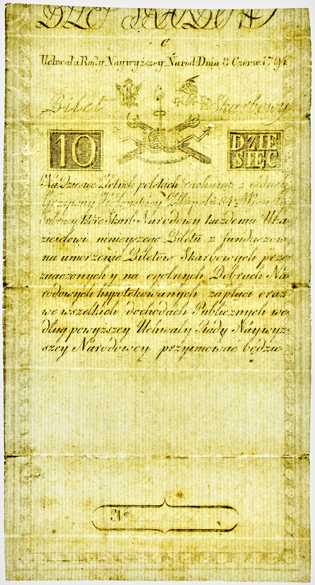 Banknot lekko podprasowany. Na lewym skraju fragment napisowego znaku wodnego z nazwą wytwórni papieru