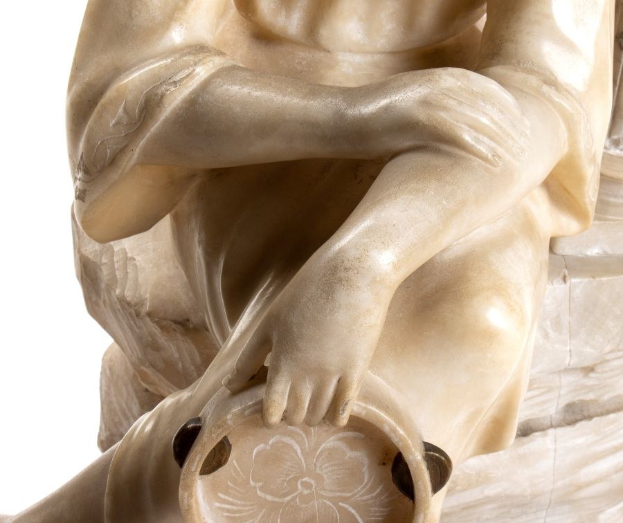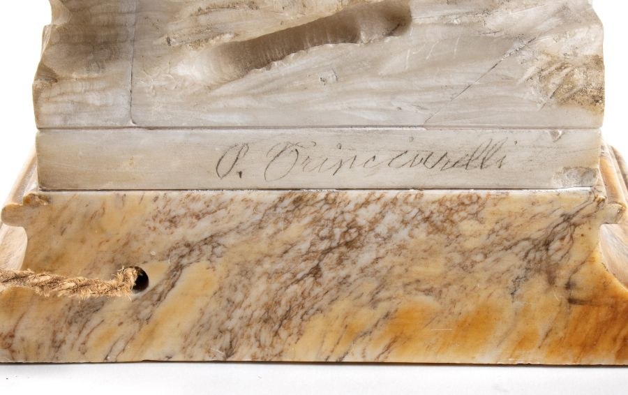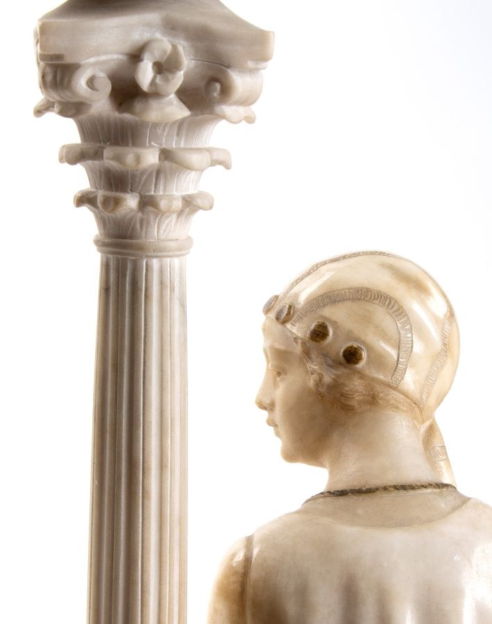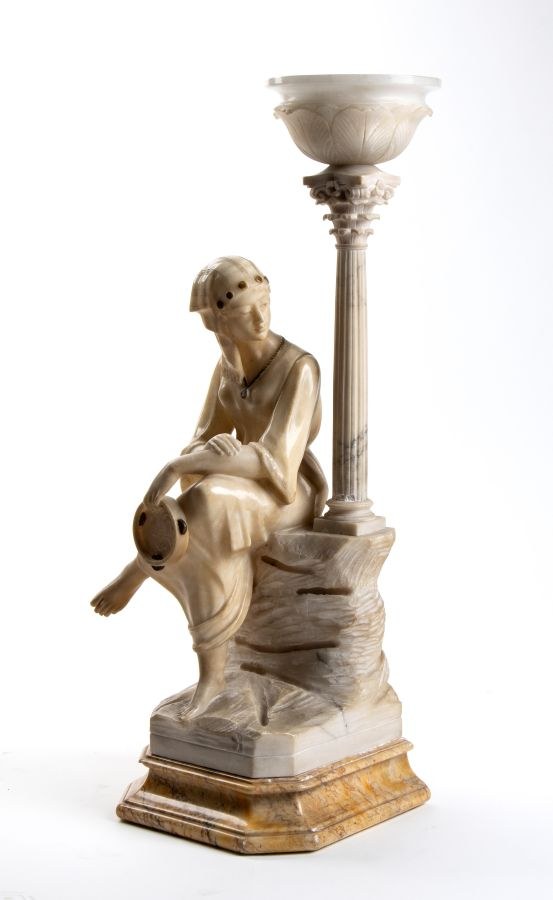figure of gypsy woman in alabaster on marble base Italian Art Nouveau school. On the back of the base unreadable signature. Italian alabaster lamp