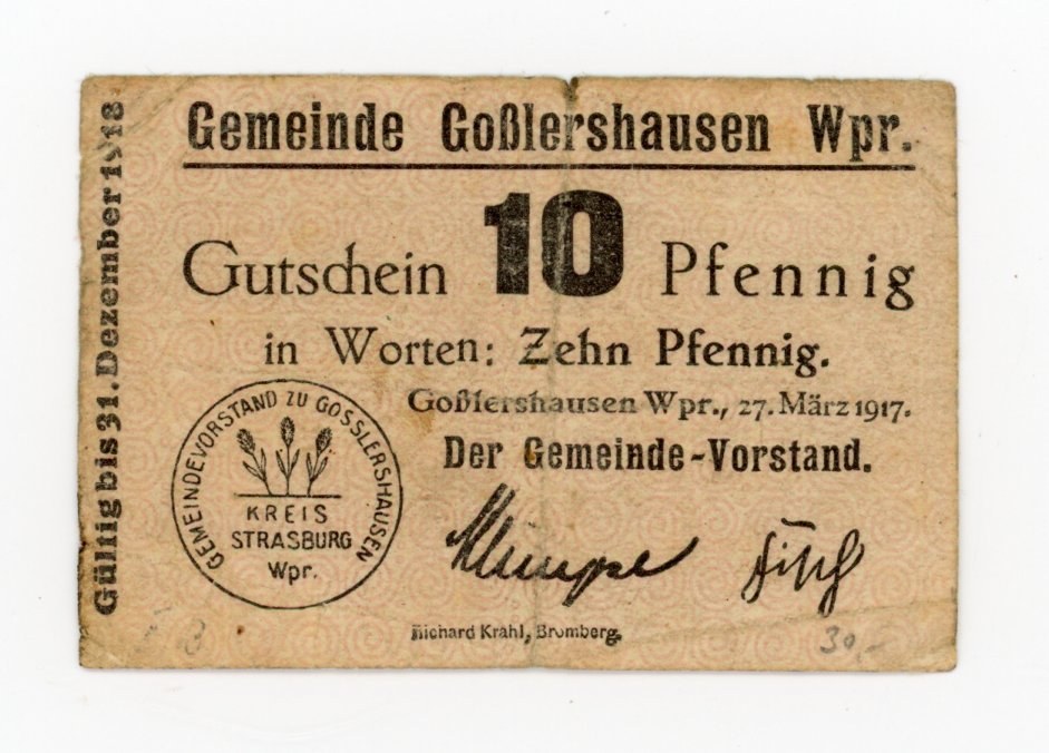 Jabłonowo Pomorskie/Gosslershausen Wpr., 10 fenigów 1917. Stan zachowania 3-.