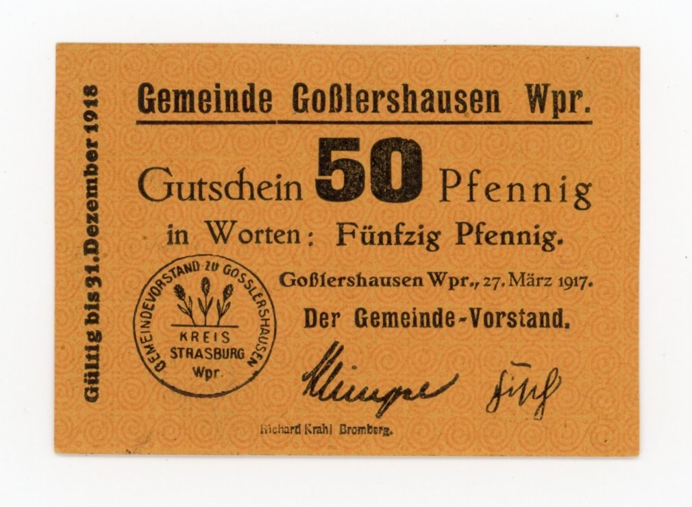 Jabłonowo Pomorskie/Gosslershausen Wpr., 50 fenigów 1917. Stan zachowania 1.