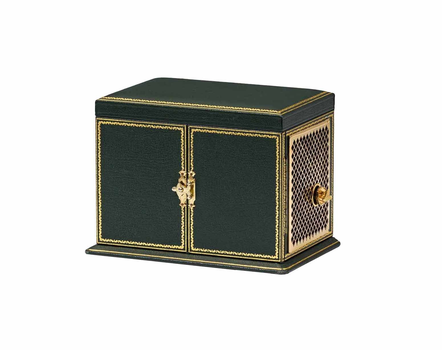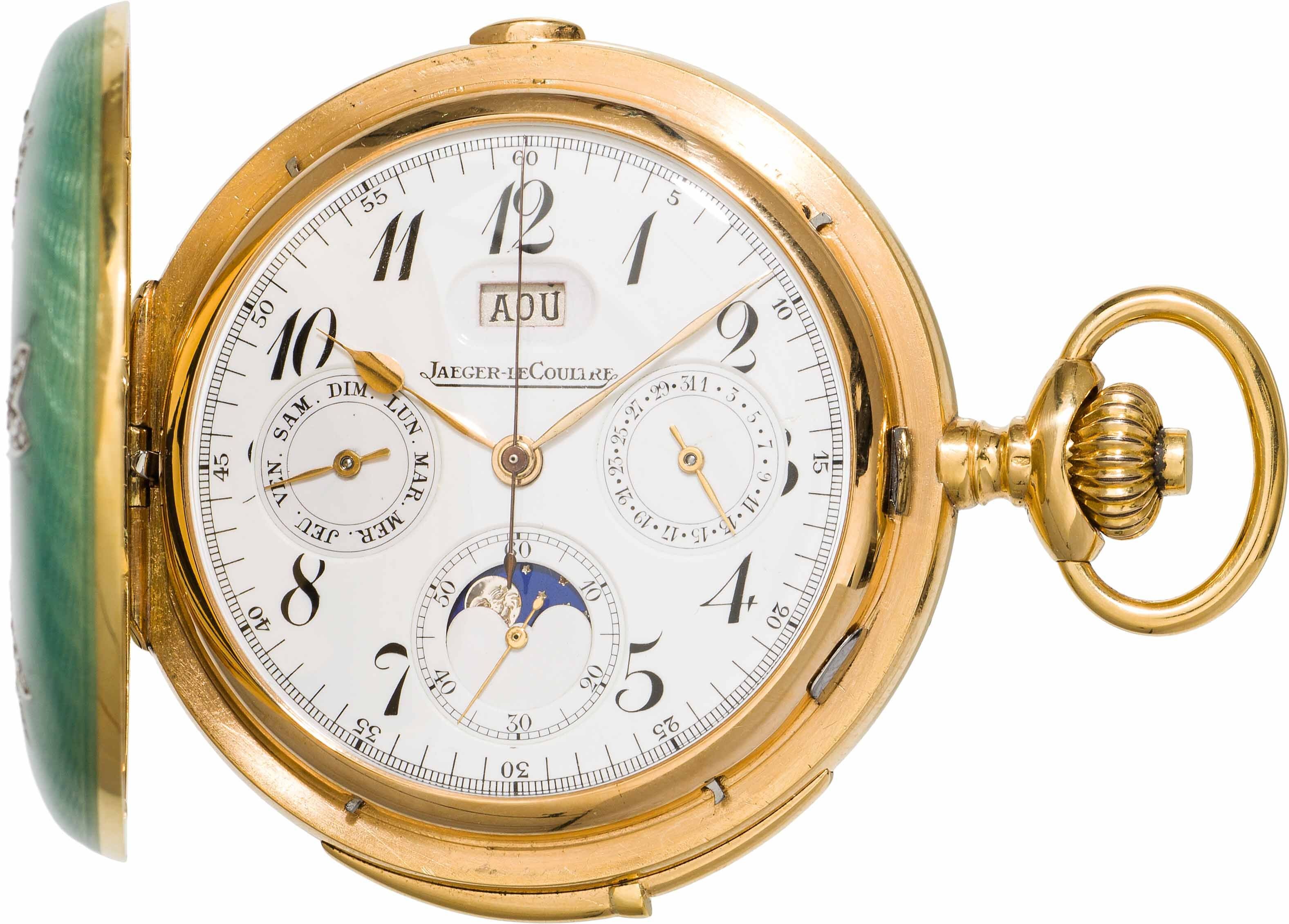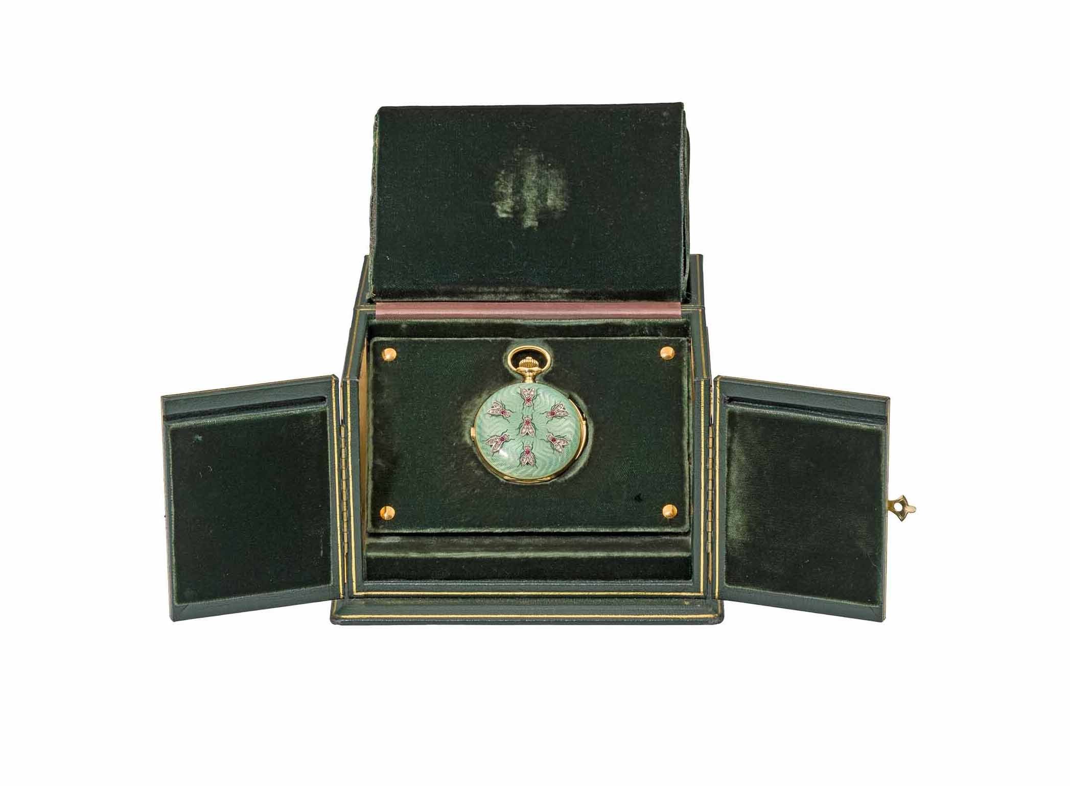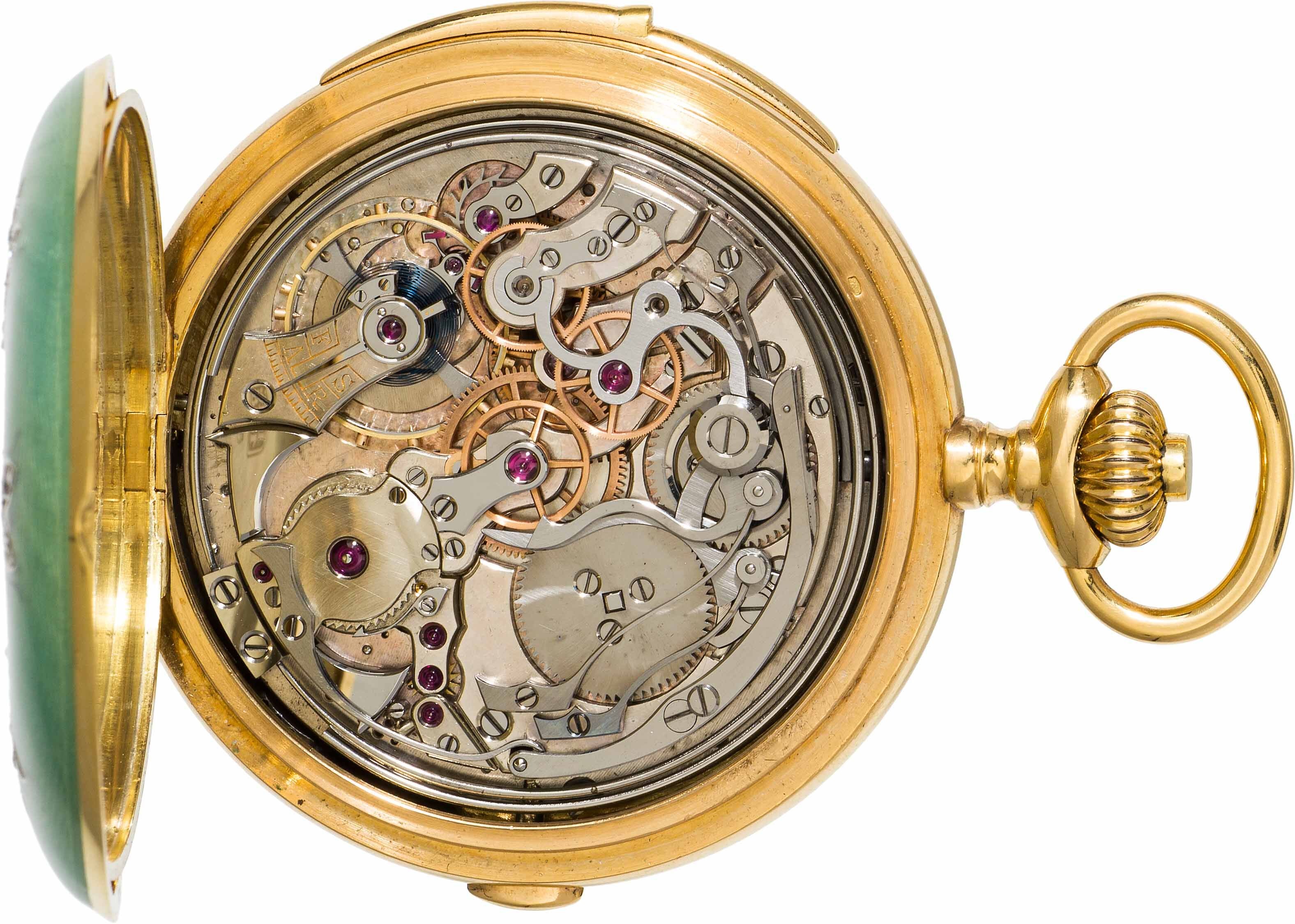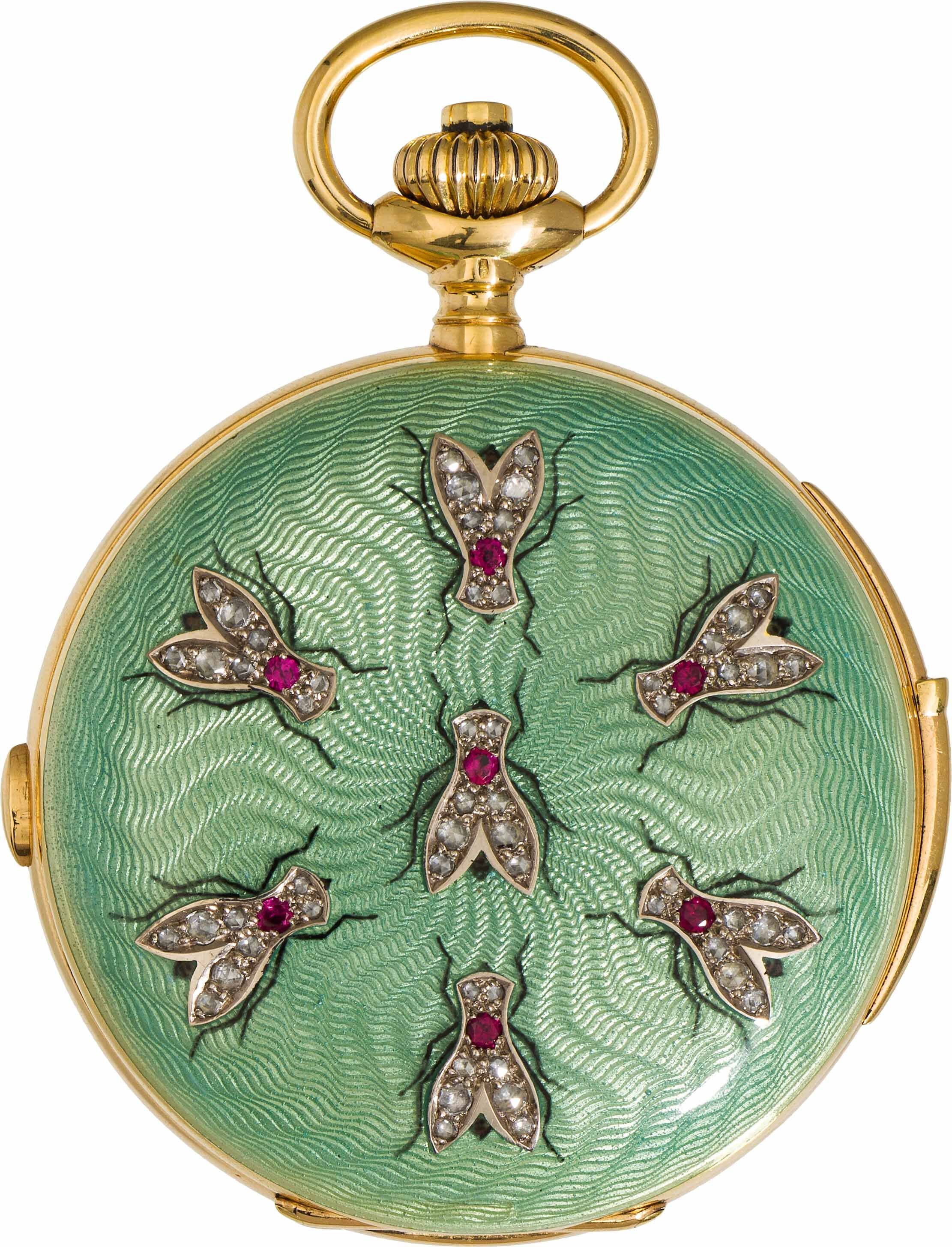 18k gold, translucid turquoise enamel, diamonds, rubies; crown winding, heavy hunter with complexly guilloché case and overlaid with translucid turquoise front and back with 7 flies each; each fly with 1 ruby and 8 diamonds, case no. "40271"; enamel dial signed; 3 subdials for small second with moonphase, date and weekday, window for month; anchor escapement with stone palettes, screwed endstone, minute repeater on gong spring; very good condition; custom-made travel etui, with green, gold embossed leather and brass; one side with gilded trigger of the repeater in form of a fly