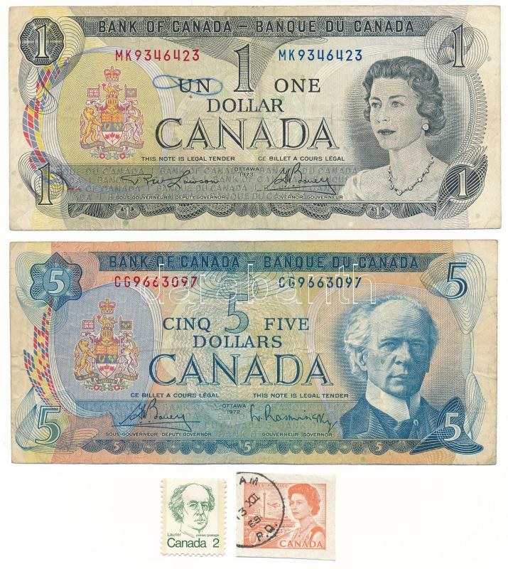 Kanada 1972. 5$ tematikailag hozzáillő bélyeggel + 1973. 1$ tematikailag hozzáillő pecsételt bélyeggel T:F, egyiken tollal írt firka Canada 1972. 5 Dollars with a thematically appropriate stamp + 1973. 1 Dollar with a thematically appropriate stamped stamp C:F, pen scrabble on one Krause P#85, P#87