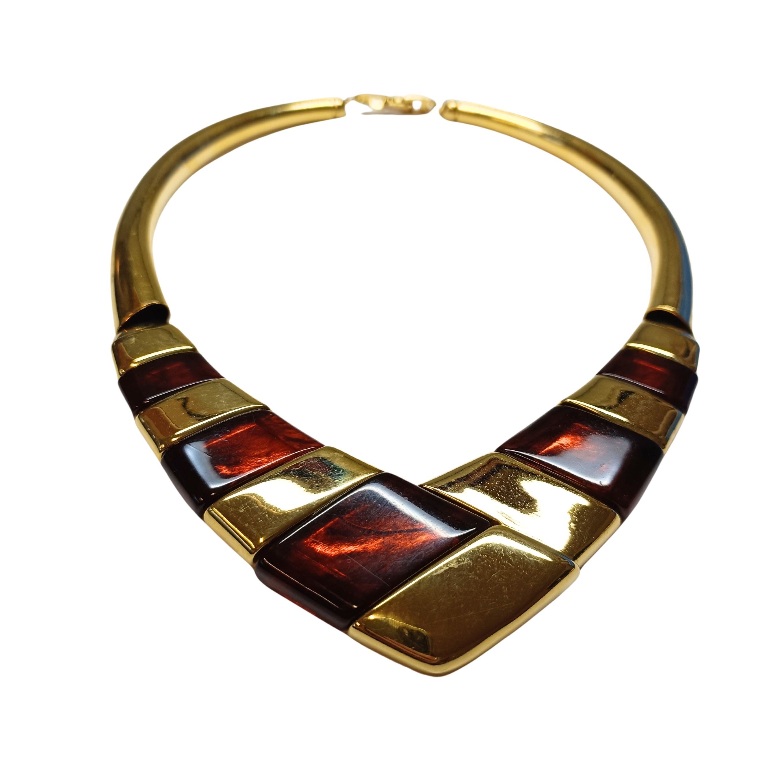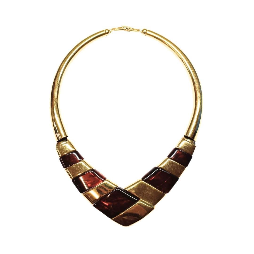 Imponująca kolia amerykańskiej marki Napier*, z lat 80. Gemoetryczna kolia o designie inspirowanym Art déco, została wykonana z metalu w kolorze złotym, łączonego z materiałem zwanym lucite w kolorze szylkretowym**.