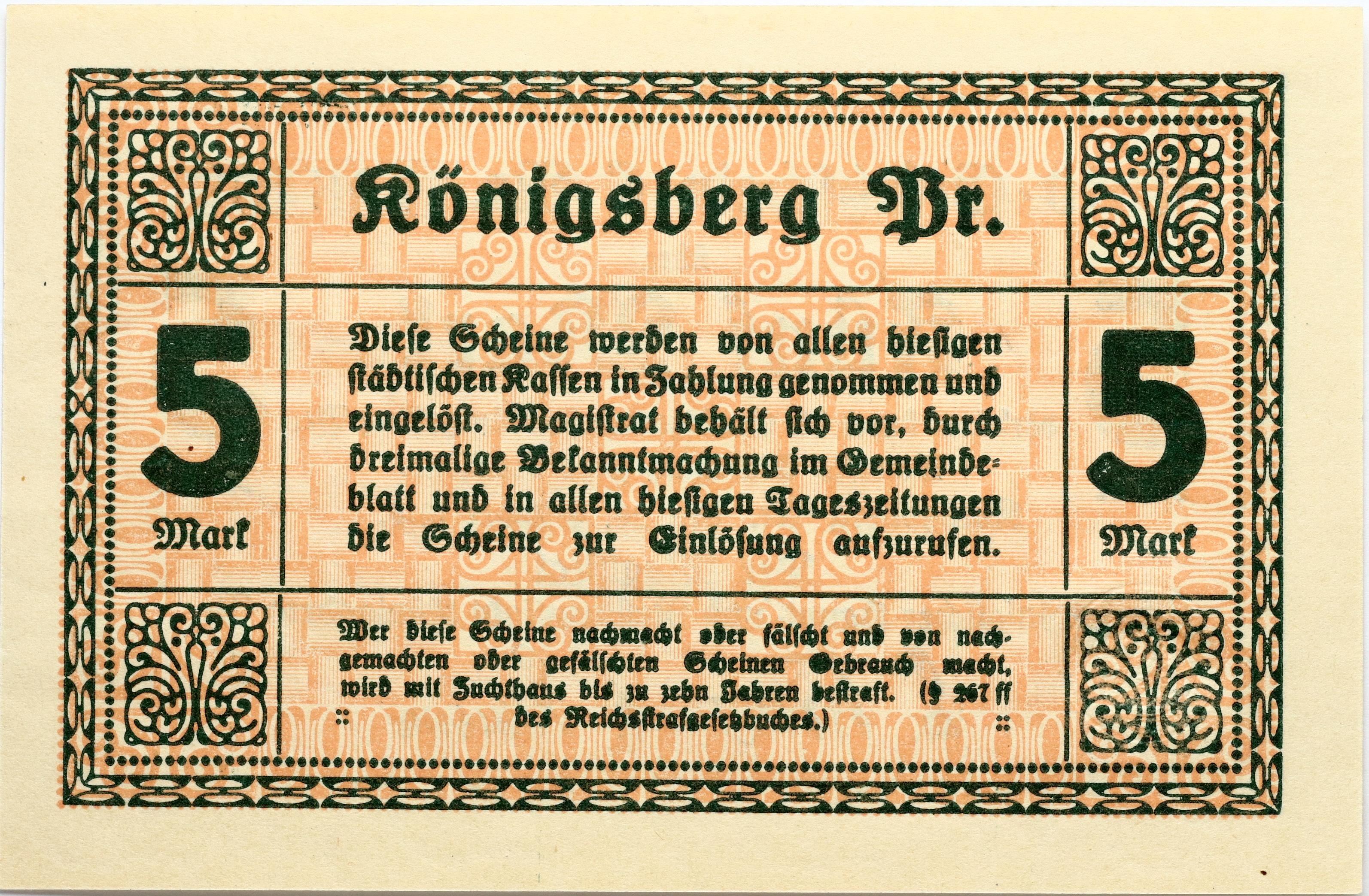 East Prussia, Konigsberg. Notgeld 5 Mark 26.10.1918. S/N 106498.