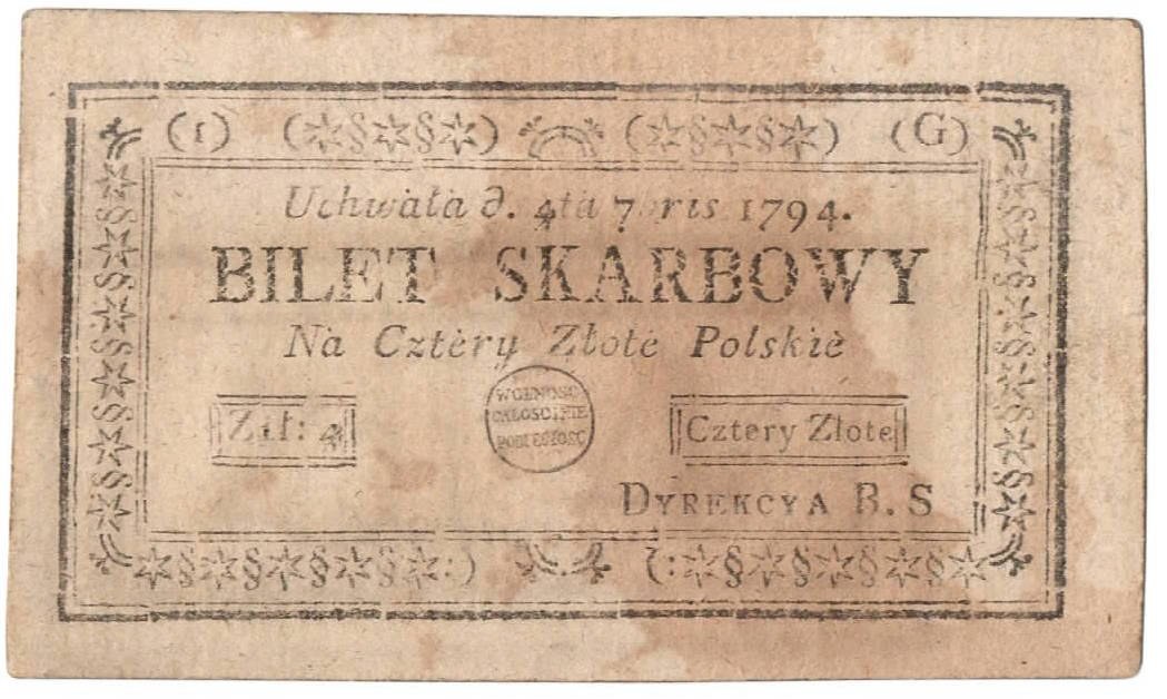 Dobrze zachowany egzemplarz banknotu Insurekcji Kościuszkowskiej o nominale 4 złotych autorstwa Karola M. Grölla.