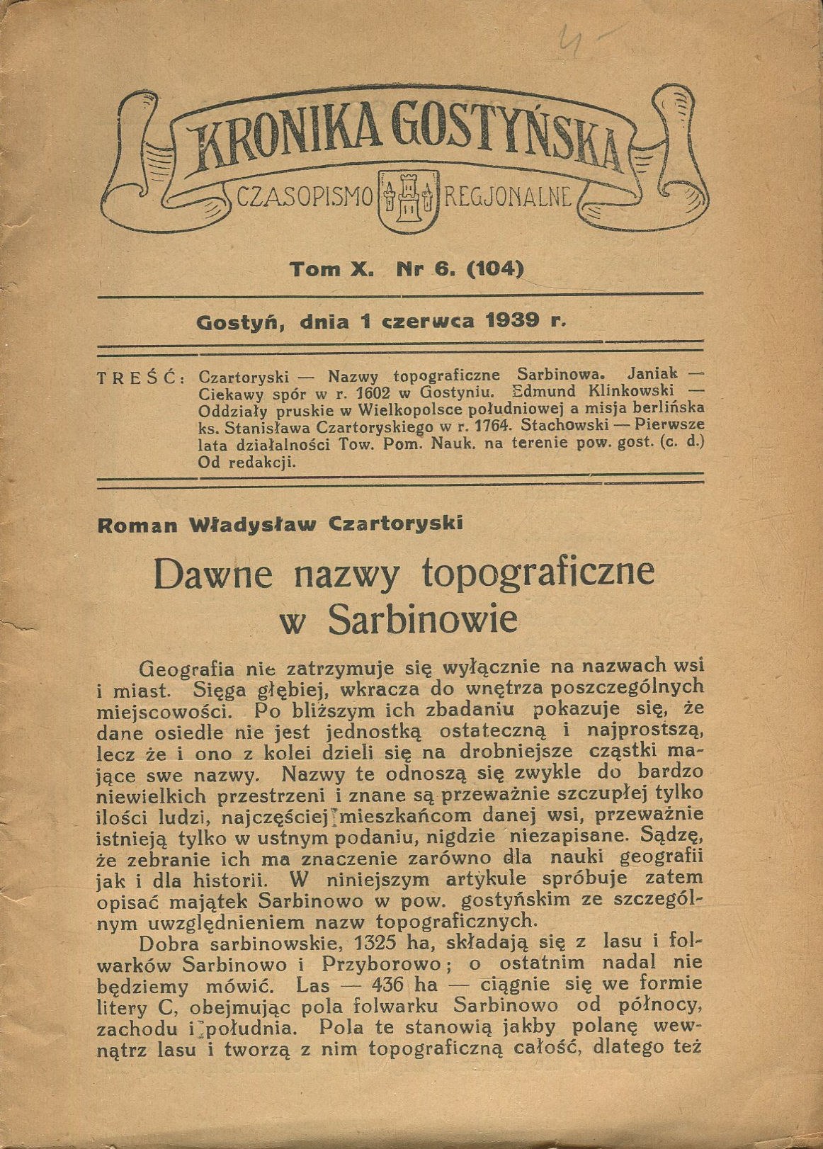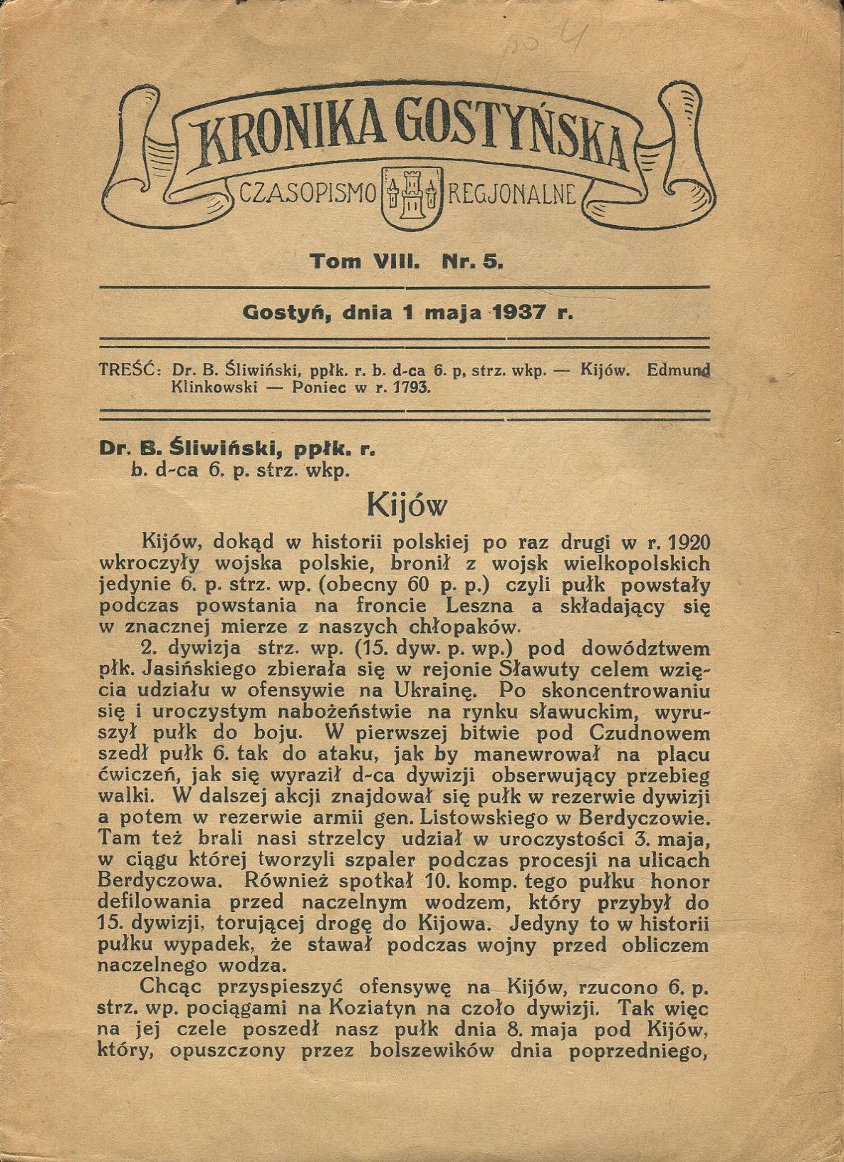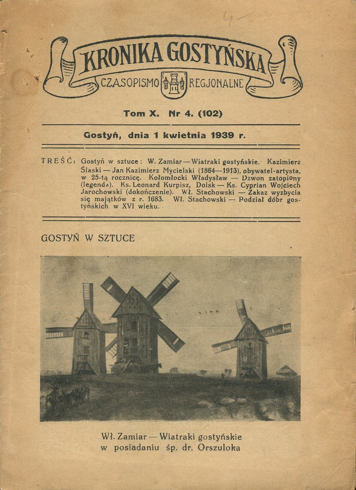 Zestaw 3 numerów (5 z 1 maja 1937 roku oraz 4 (102) z 1 kwietnia i 6 (104) z 1 czerwca z 1939 roku) Kroniki gostyńskiej, czasopisma regionalnego wydawanego w Gostyniu (Wielkopolska). W treści m.in.: Kijów (w r. 1920). Poniec w r. 1793. Jan Kazimierz Mycielski (1864-1913), obywatel-artysta w 25-tą rocznicę zgonu. Dzwon zatopiony, legenda poniecka. Zakaz wyzbywania się majątków z r. 1683. Podział dóbr gostyńskich w XVI wieku. Dawne nazwy topograficzne w Sarbinowie. Ciekawy spór z r. 1602 w Gostyniu. Oddziały pruskie w Wielkopolsce południowej a misja berlińska ks. Stanisława Czartoryskiego w r. 1764.