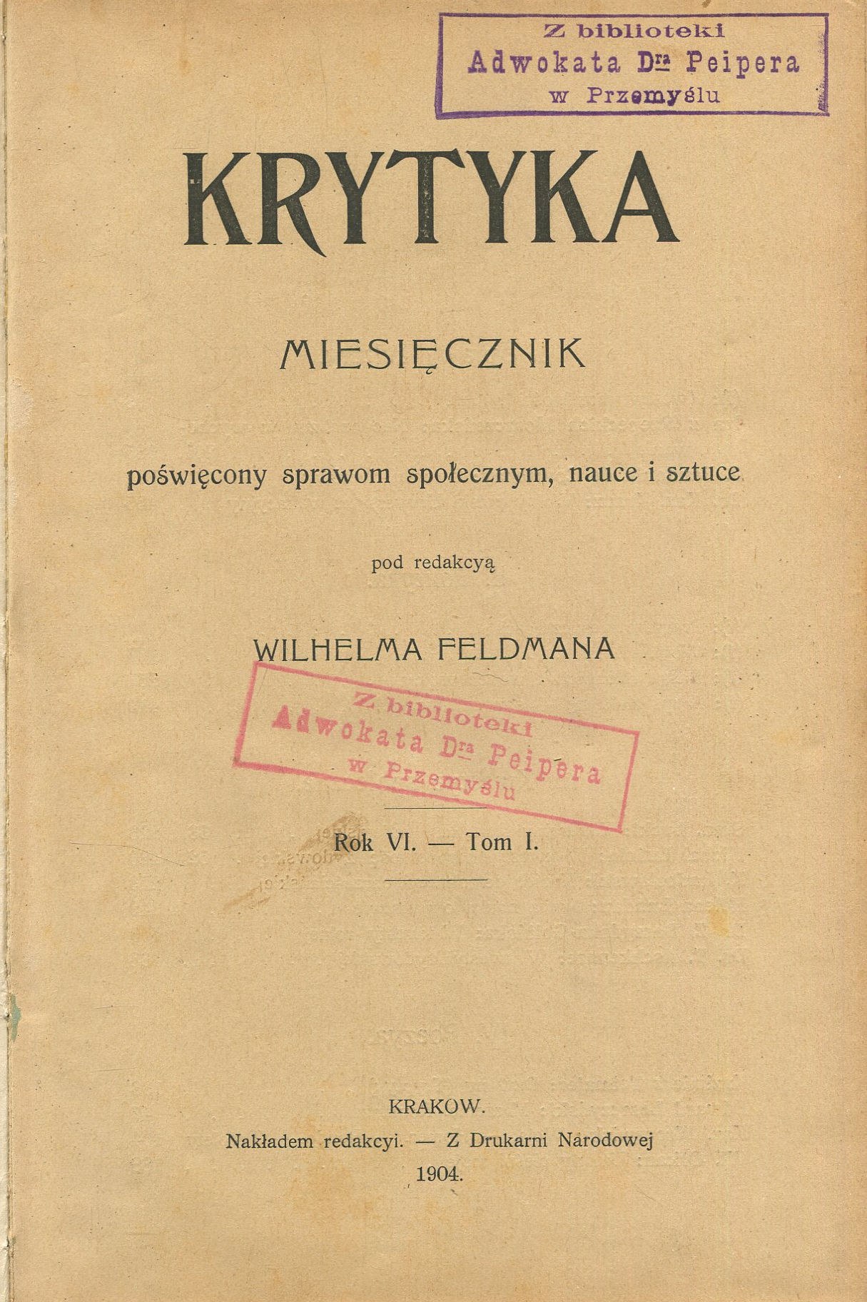 Rocznik 1904 (w dwóch tomach) miesięcznika Krytyka, czasopisma ukazującego się w Krakowie w latach 1899–1914 pod redakcją Wilhelma Feldmana. Pismo miało charakter literacko-społeczny, publikowało artykuły z zakresu krytyki literackiej, historii, filozofii, sztuki i polityki. Było forum dla publicystów i intelektualistów związanych z postępowymi nurtami życia kulturalnego i politycznego przełomu XIX i XX wieku. Na jego łamach dyskutowano o problemach narodowych, społecznych i o roli sztuki w kształtowaniu świadomości.