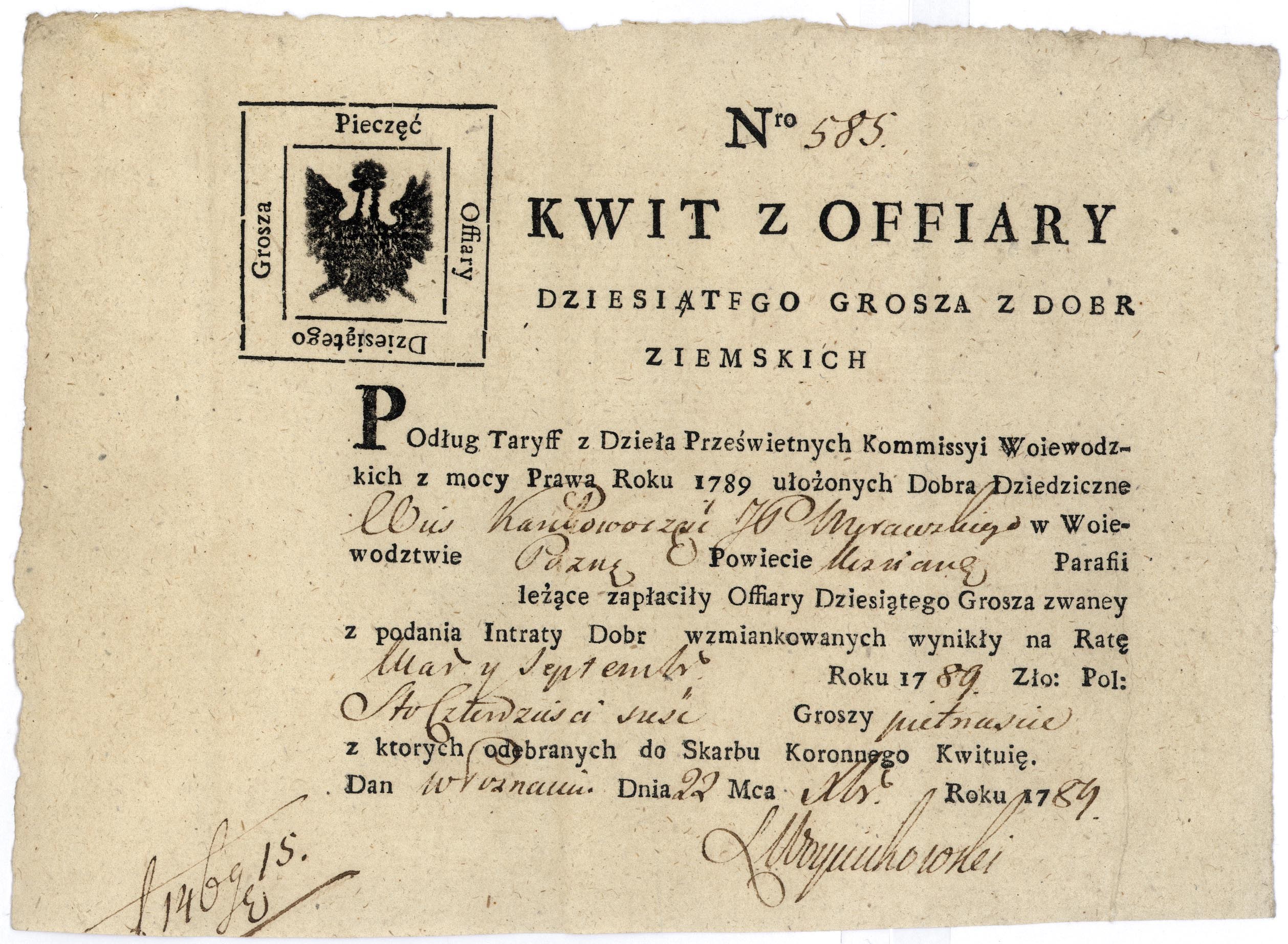 Banknoty dominialne, kwit z ofiary dziesiątego grosza z dóbr ziemskich, 22.11.1789, kwit potwierdzający zapłatę wystawiony dla wsi Kantowocz w Poznańskim, papier ze znakiem wodnym