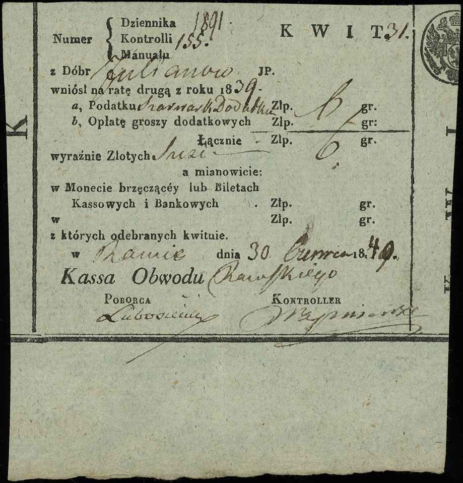 XIX-wieczne kwity z opłat, kwit z opłaty podatku z Dóbr Julianowo, obwodu rawskiego z 1840 r. na kwotę 6 złotych, ładnie zachowane