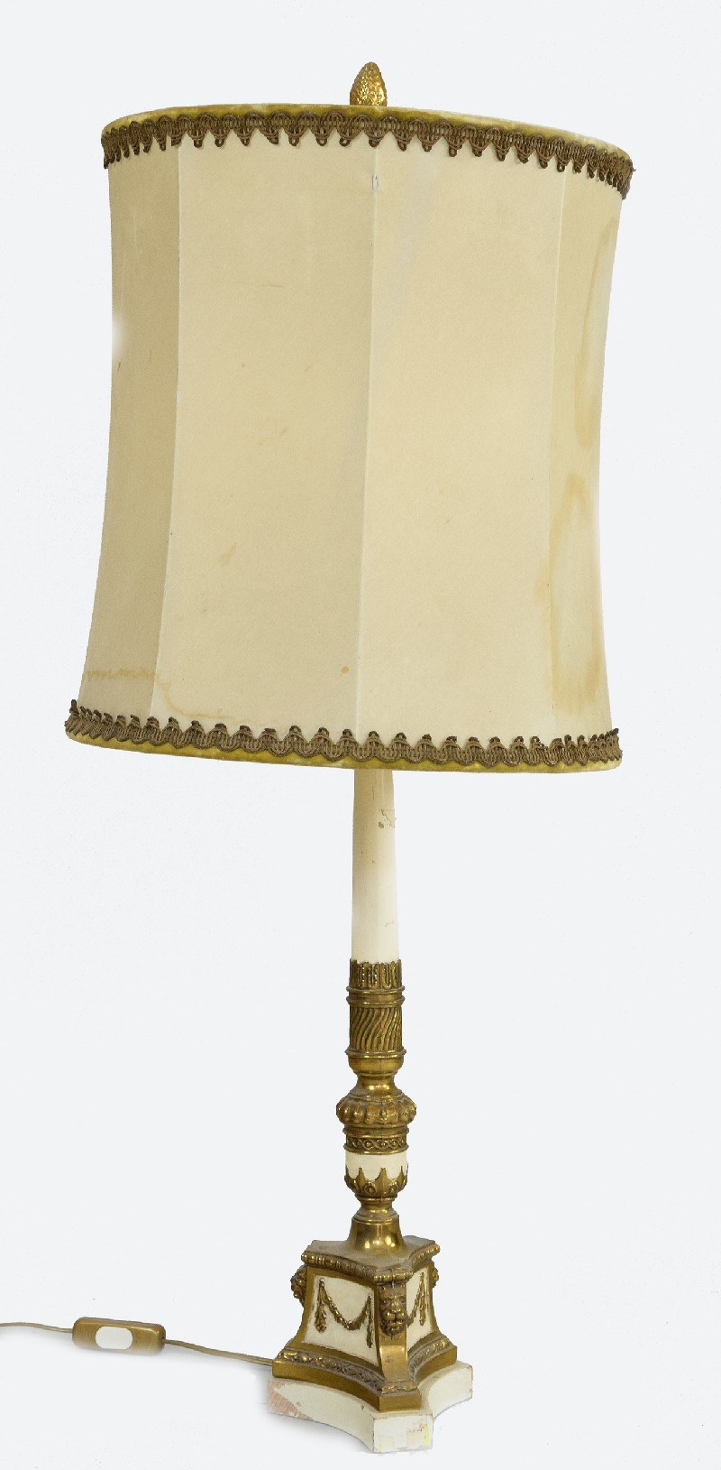 mosiądz, drewno, farba; wys. całk. 89 cm, średn. abażuru 35 cm;