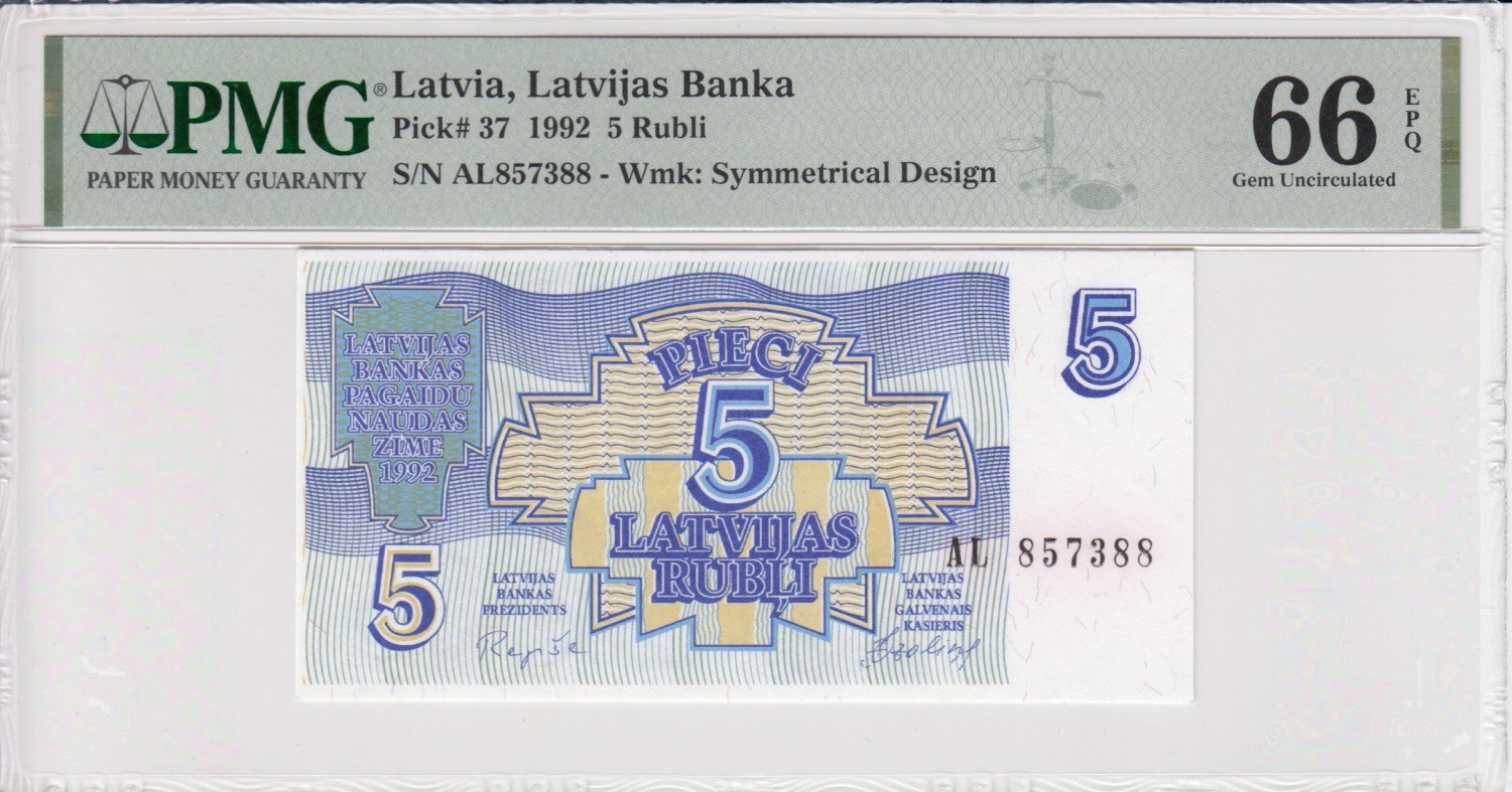 Latvia (Latvijas Banka) 5 Rubli 1992 - PMG 66 EPQ Gem Uncirculated