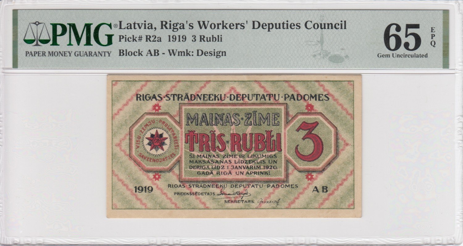 Latvia (Riga's Workers' Deputies Council) 3 Rubli 1919 - PMG 65 EPQ Gem Uncirculated