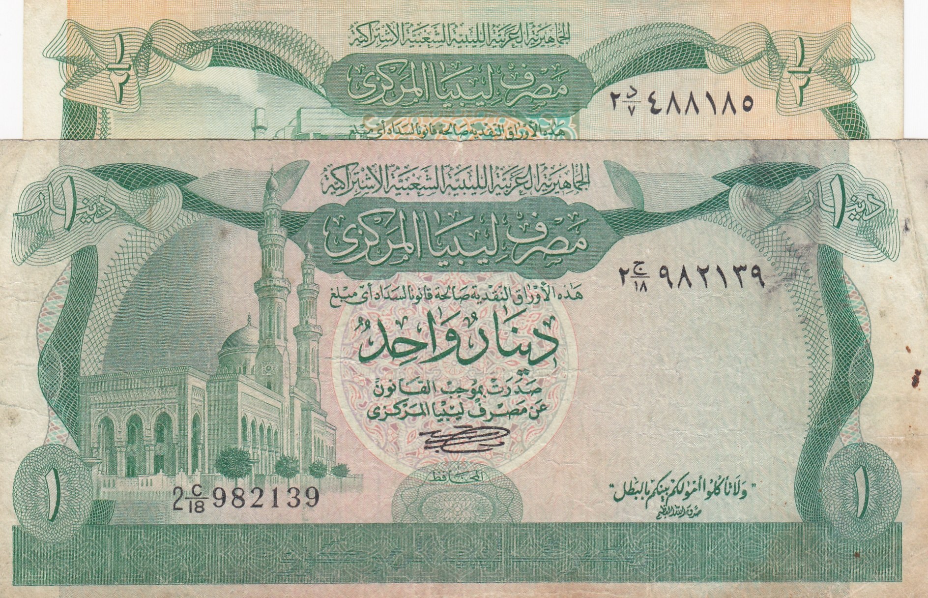 Libya, 1/2 Dinar and 1 Dinar, 1981, VF / XF, p43a / p44a, (Total 2 banknotes)