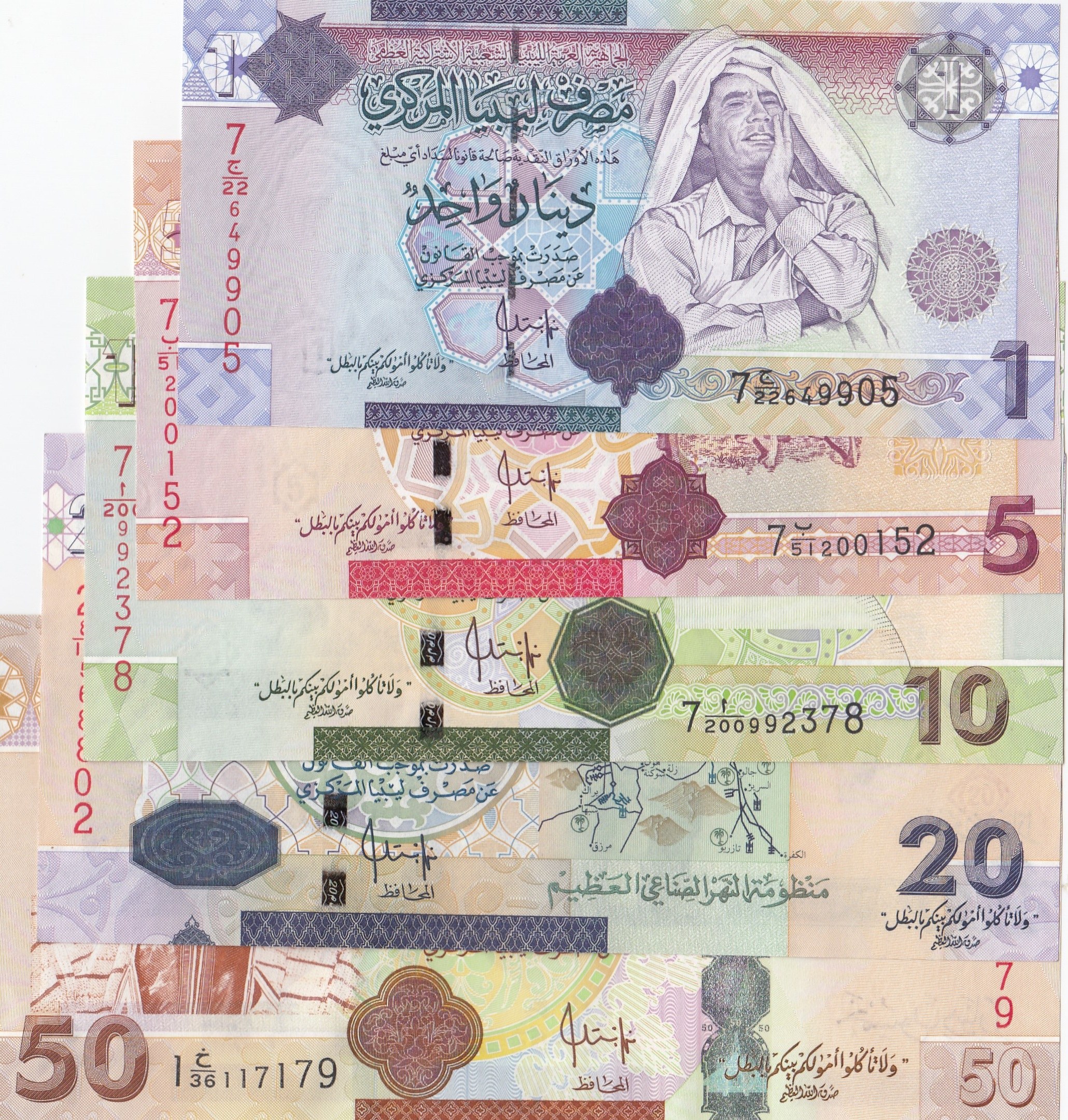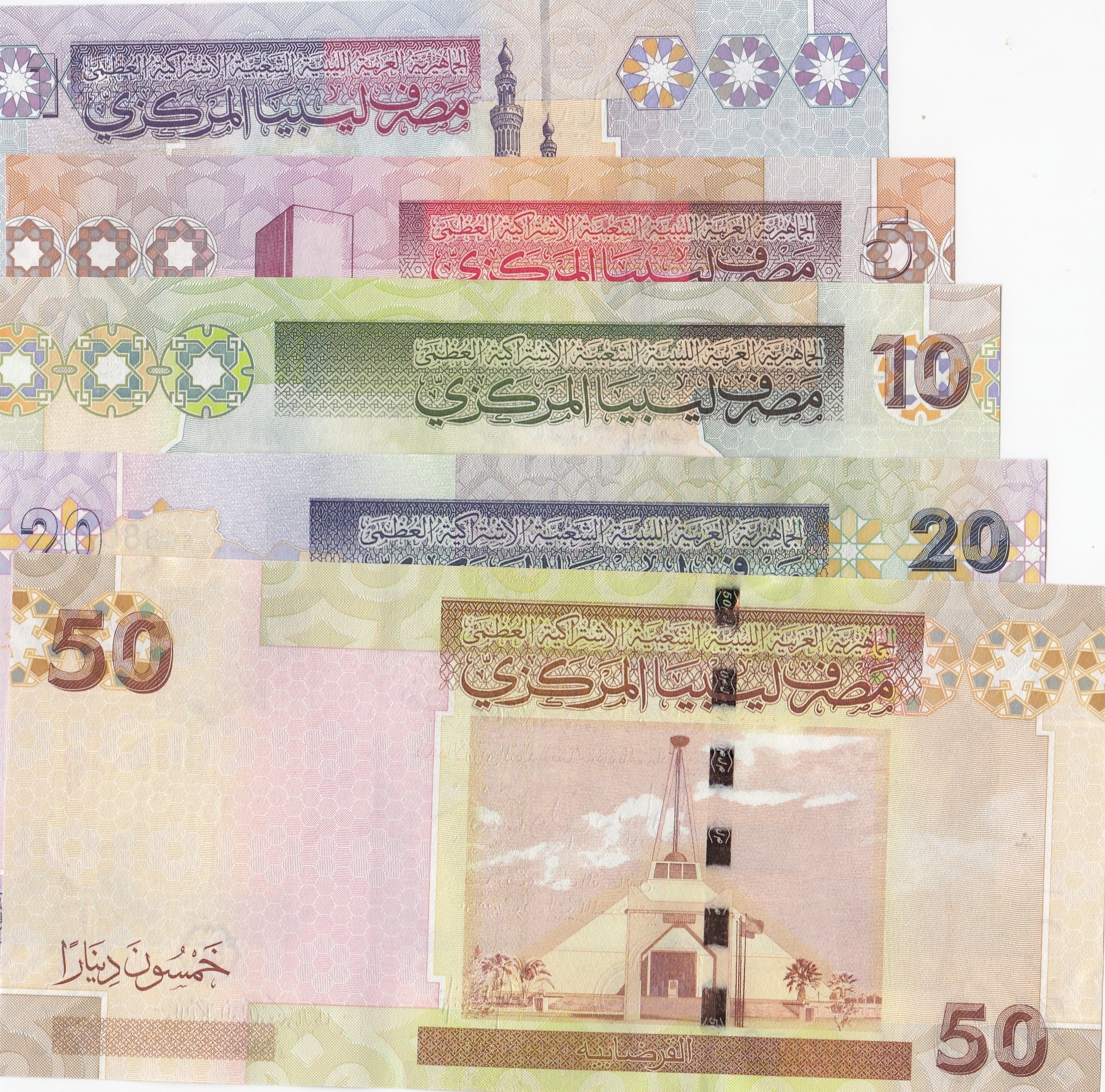 Libya, 1 Dinar, 5 Dinar, 10 Dinar, 20 Dinar and 50 Dinar, 2008, UNC, p71 …p75, (Total 5 banknotes)