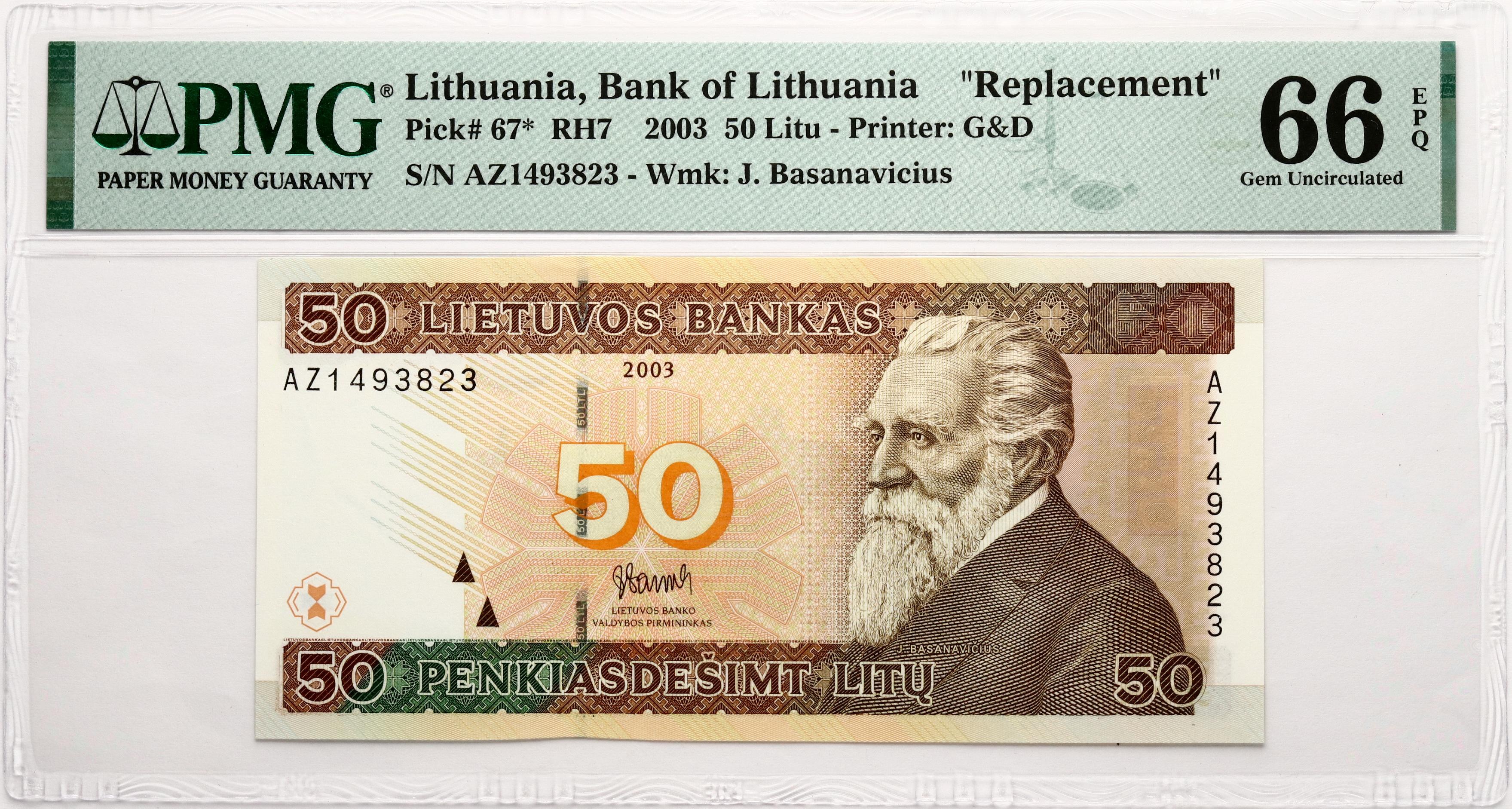 Lithuania. 50 Litu 2003. S/N AZ1493823. Pick# 67*. PMG 66 Gem Uncirculated EPQ.
