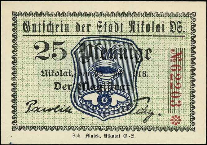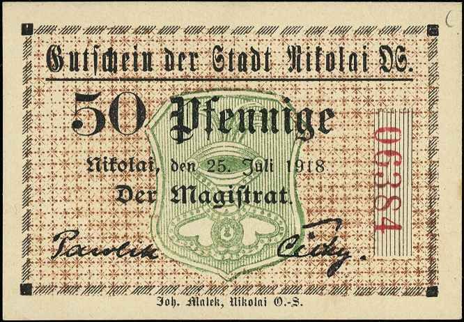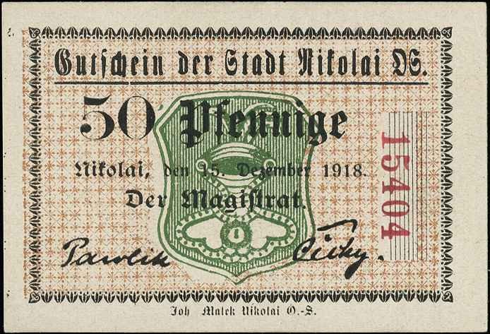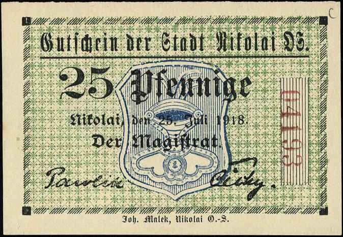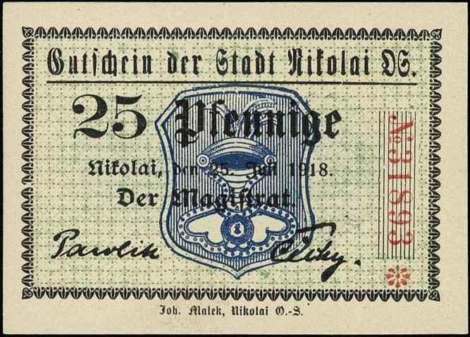 XX-wieczne banknoty zastępcze, Mikołów /Nikolai/, 25 (4 szt.) i 50 (4 szt.) fenigów, emisje 25.07.1918 i 15.12.1918, Grabowski N48.3.a,b, N.48.4.b,c(2x),d, N48.6.a,b, różne odmiany obramowania, razem 8 sztuk