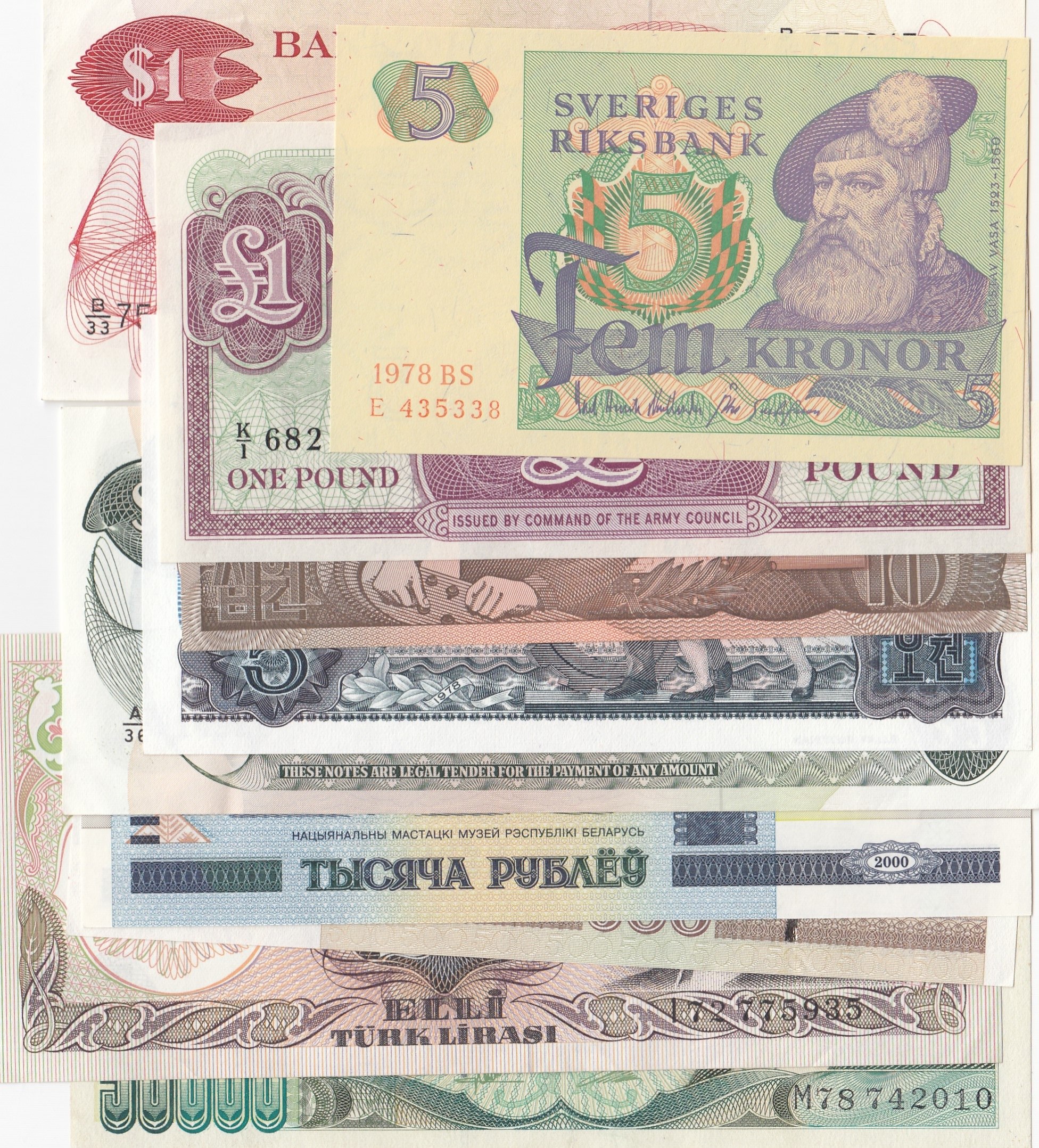 Sweden, 5 Kronur, 1978, Unc; British Armed Forced, 1 Pound, 1962, Unc; Belarus, 500 Ruble, 2000, Unc;