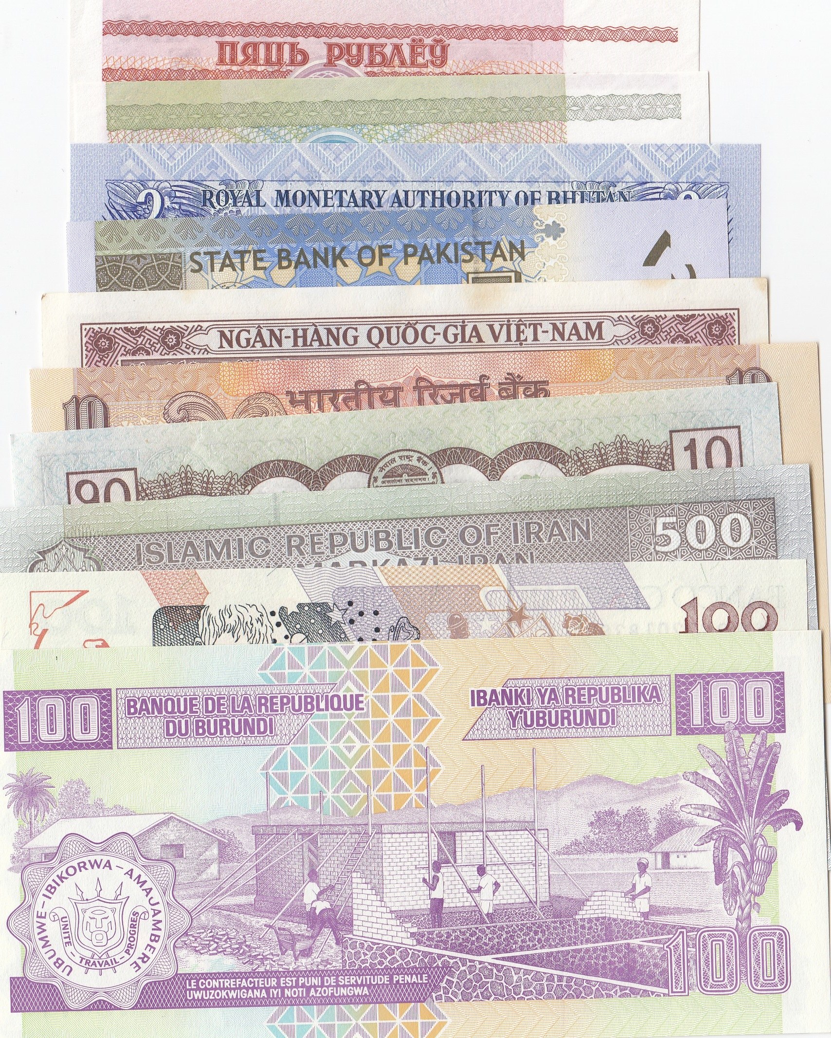 India 10 Rupees, Vietnam 1 Dong, İran 500 Rials, Tibet 10 Rupees, Belarus 5 Ruble, Pakistan 5 Rupees,