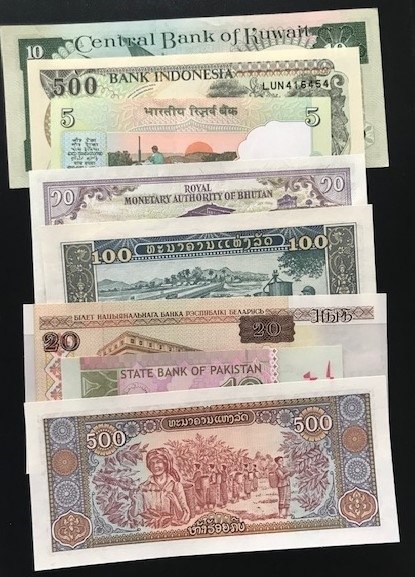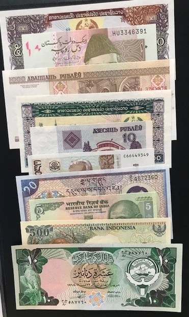 Kuwait 10 Dinars, Indonesia 500 Rupiah, India 5 Rupees, Bhutan 10 Ngultrum, Georgia 5 Lari,
