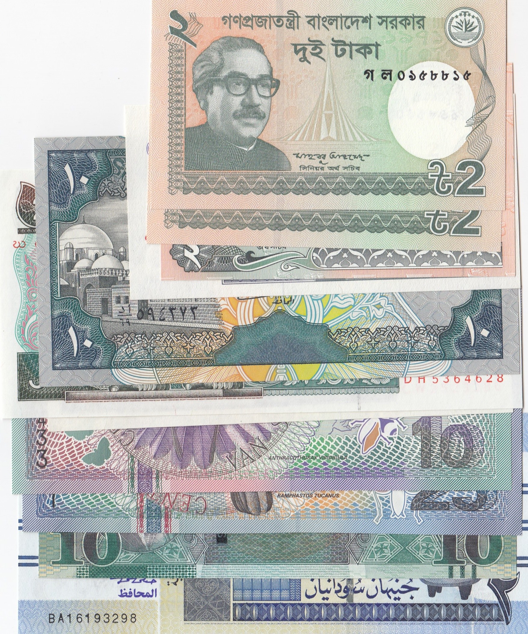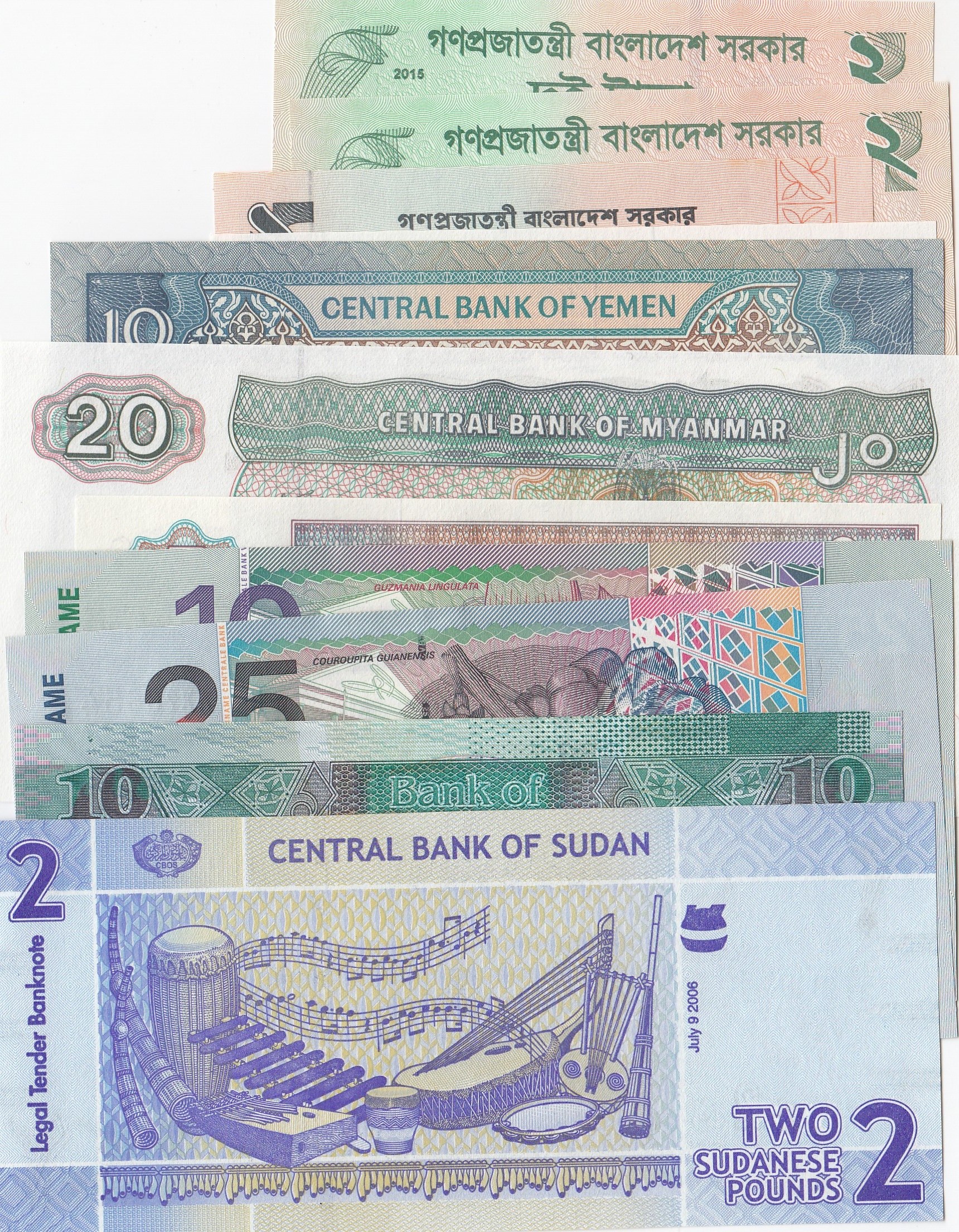 Sudan, 2 Pounds, Sudan, 10 Pounds, Suriname, 10 Gulden, Suriname, 25 Gulden, Myanmar, 1 Kyat,