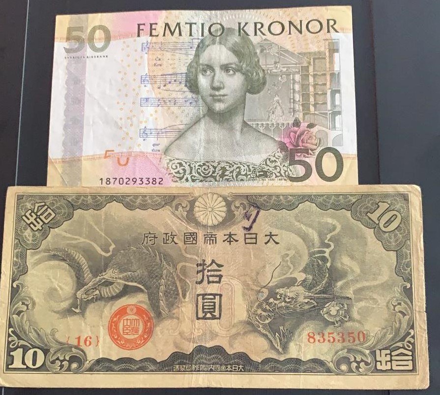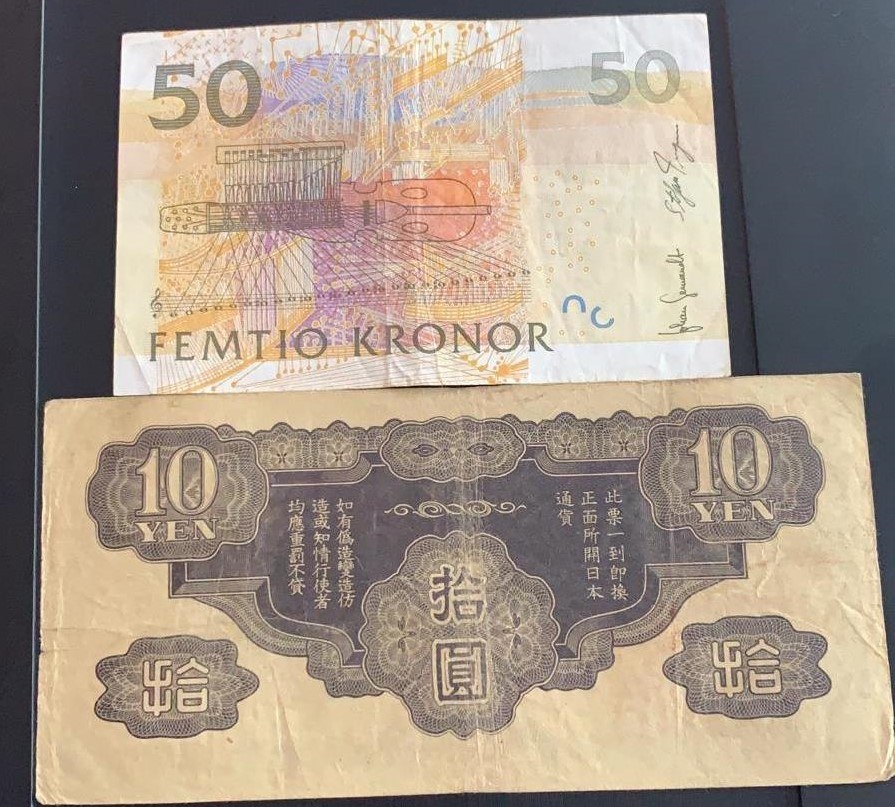 China, 10 Yen, 1939, VF; Sweden, 50 Kronor, 2011, XF