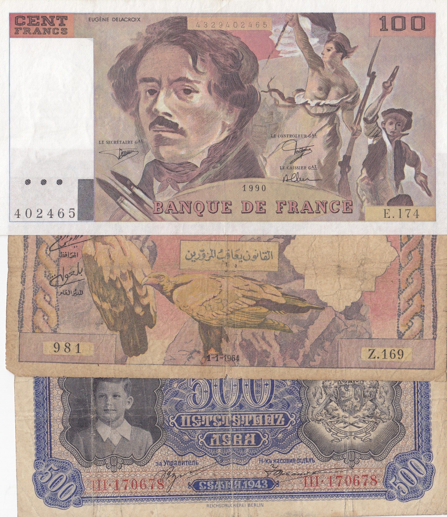 Bulgaria, 500 Leva, 1943, Fine; Algeria, 5 Dinar, 1964, Fine; France, 100 Francs, 1990, xf
