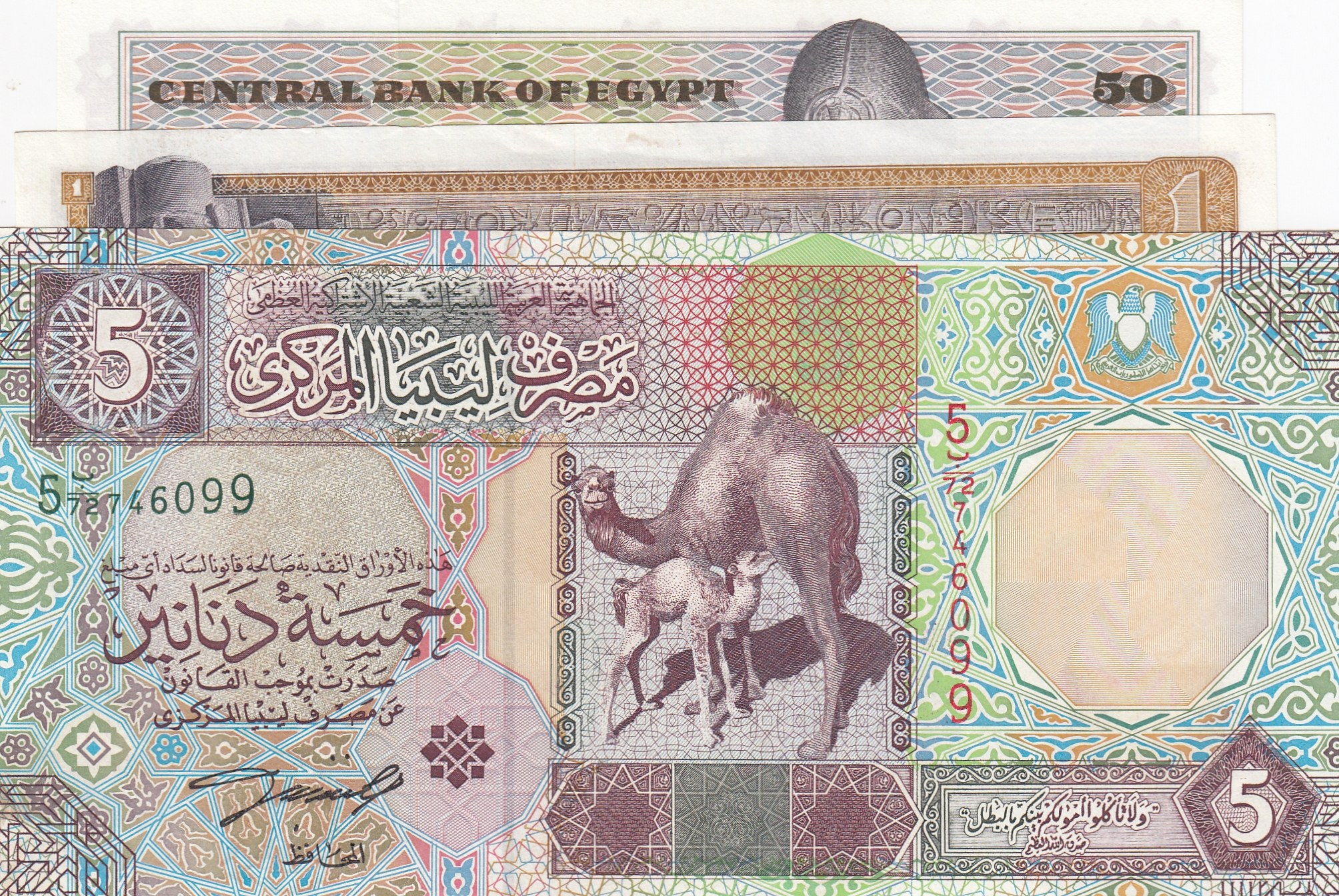 Libya 5 Dinars, Egytp 1 Pound, Egypt 50 Piastres