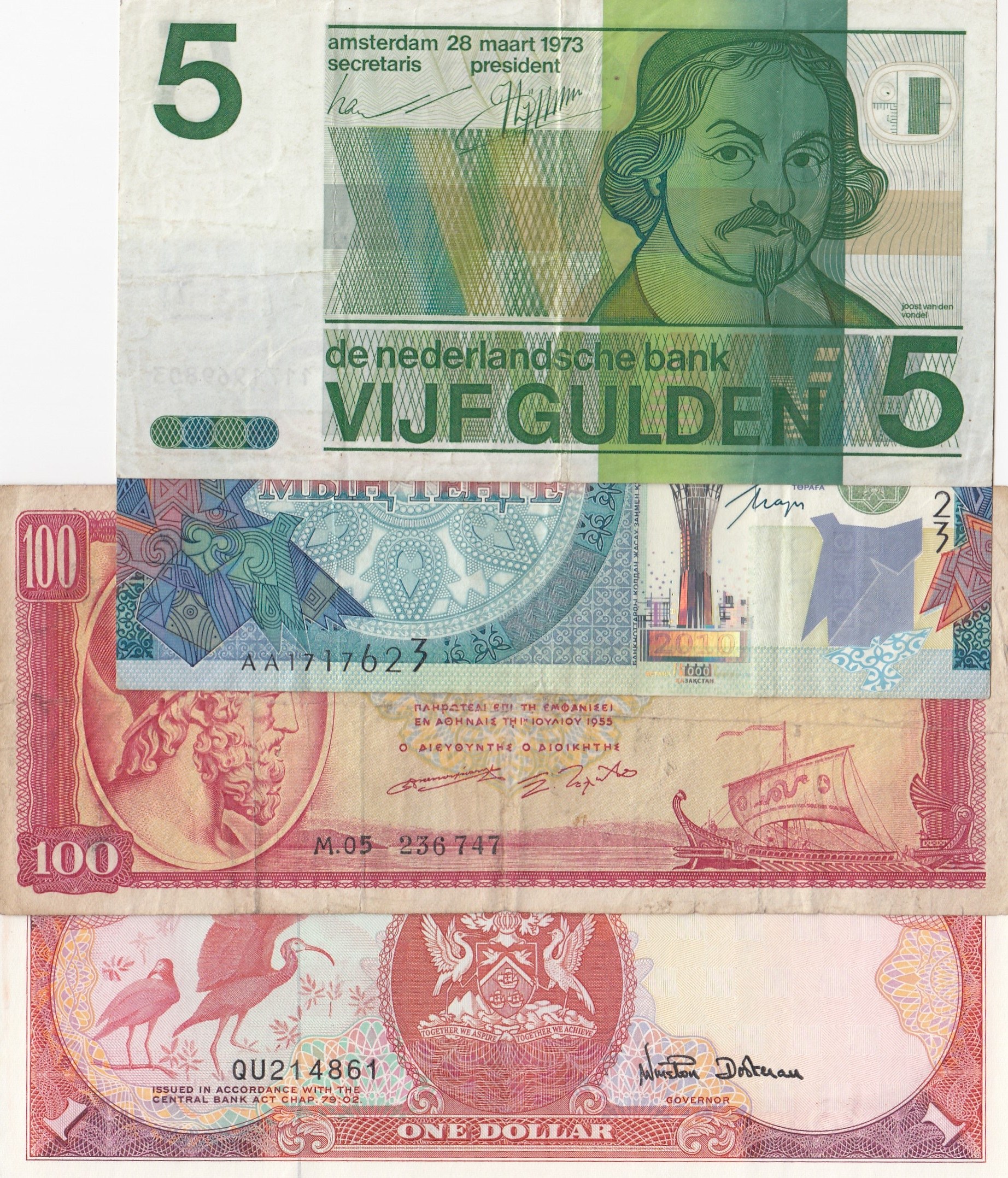 Netherlands, 5 Gulden, 1973, XF; Greece, 100 Drachmai, 1955, VF; Kazakhstan, 1000 Tenge, 2010, XF;