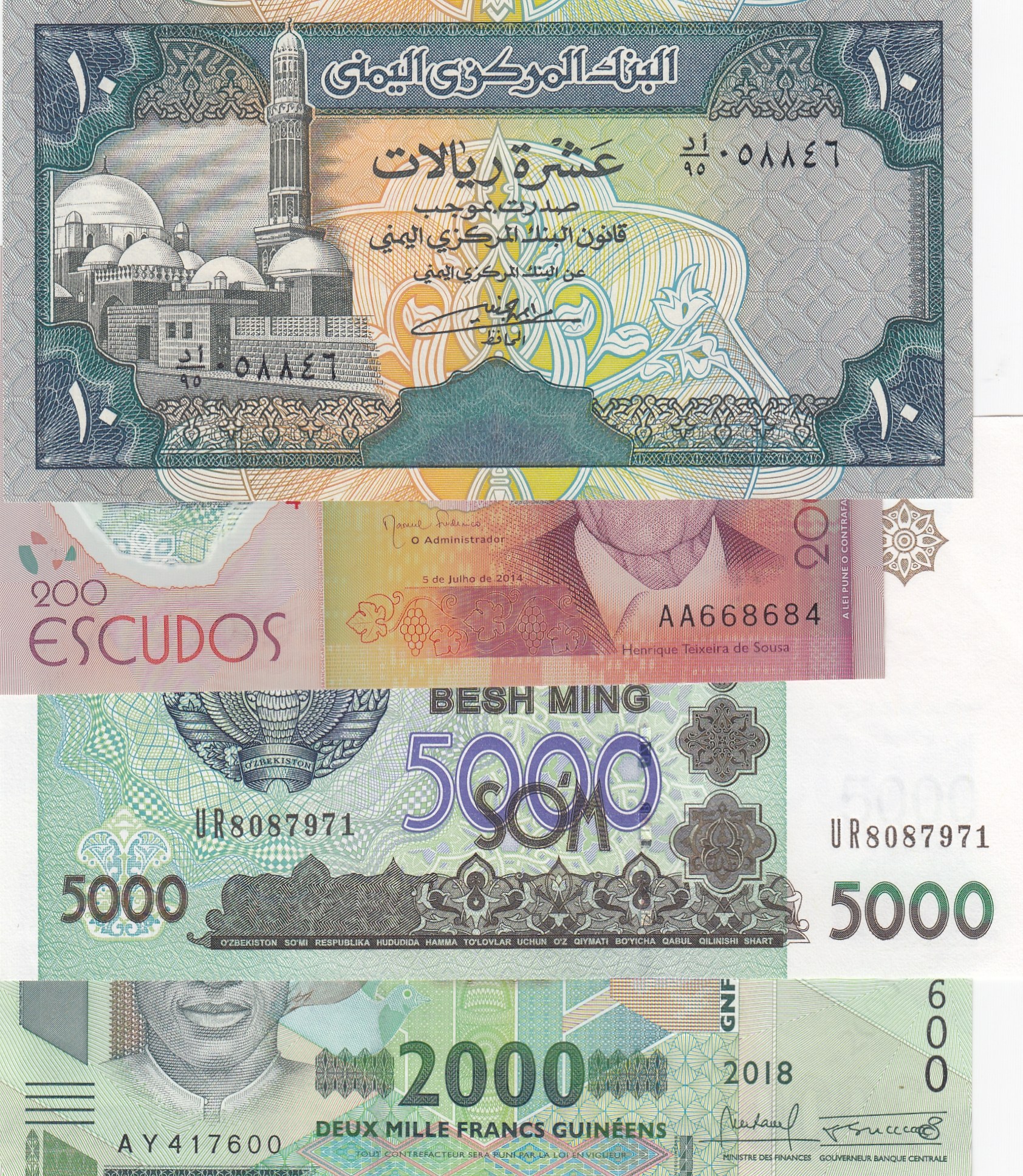 Gine, 2000 Francs, 2019, Unc; Uzbekistan, 5000 Soö, 2013, Unc; Yemen, 10 Riyal, 1990, Unc;