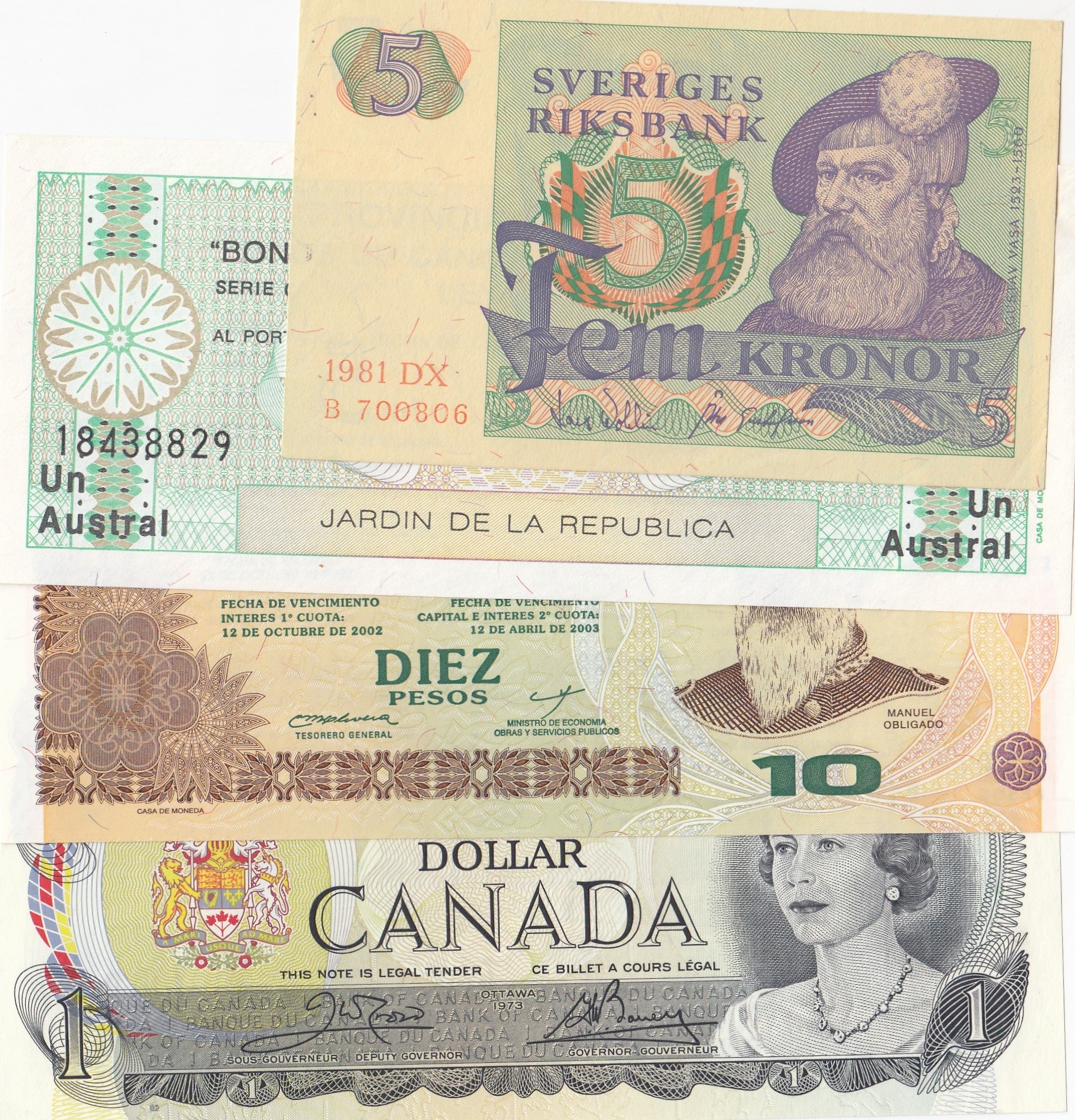 Canada, 1 Dollar, Sweden, 5 Kronor, Argentina, 10 Pesos (Cancelled), Argentina, 1 Austral (Tucuman)