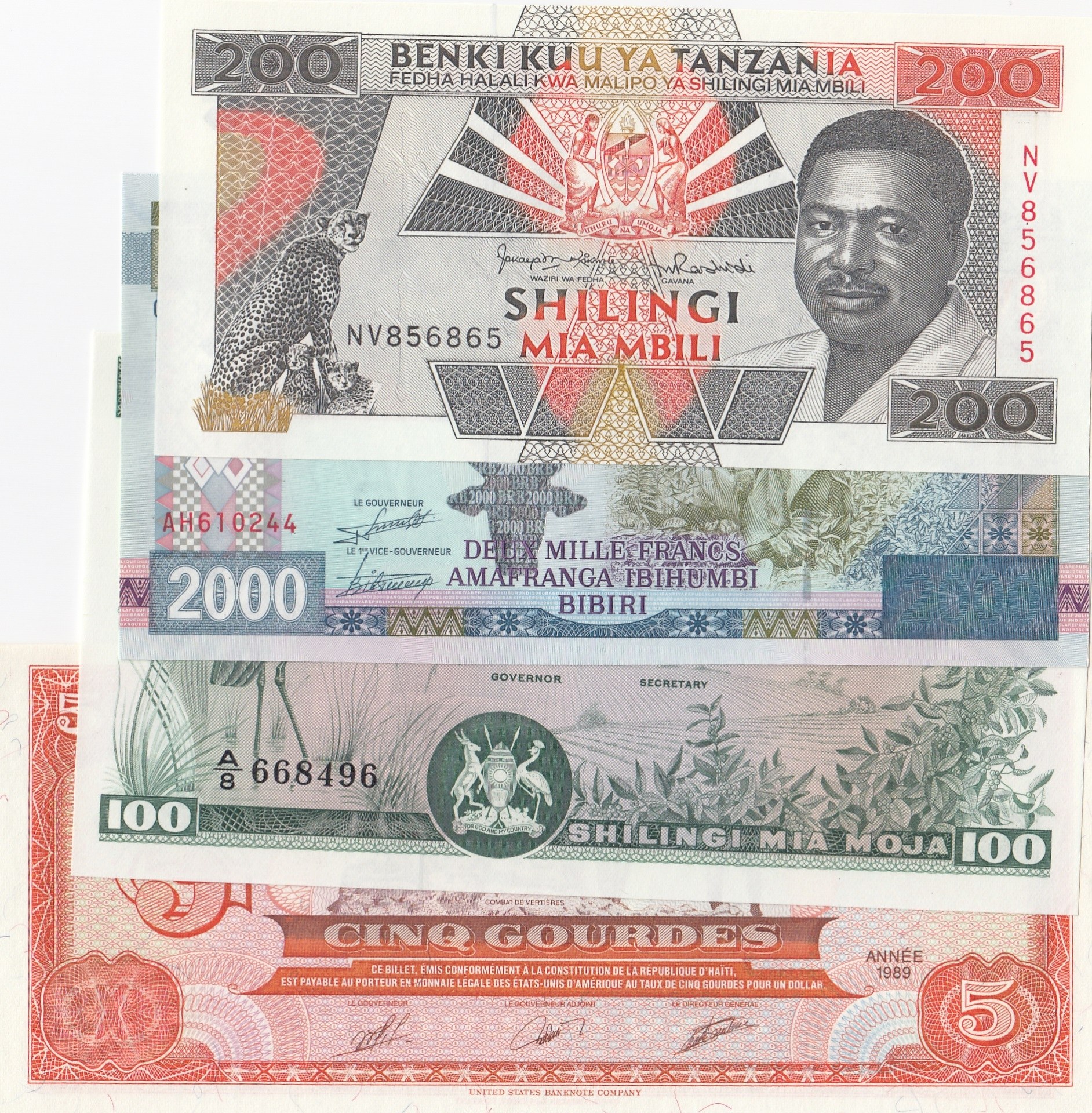 Tanzania 200 Shillings, Haiti 5 Gourdes, Uganda 100 Shililns, Burundi 2000 Francs