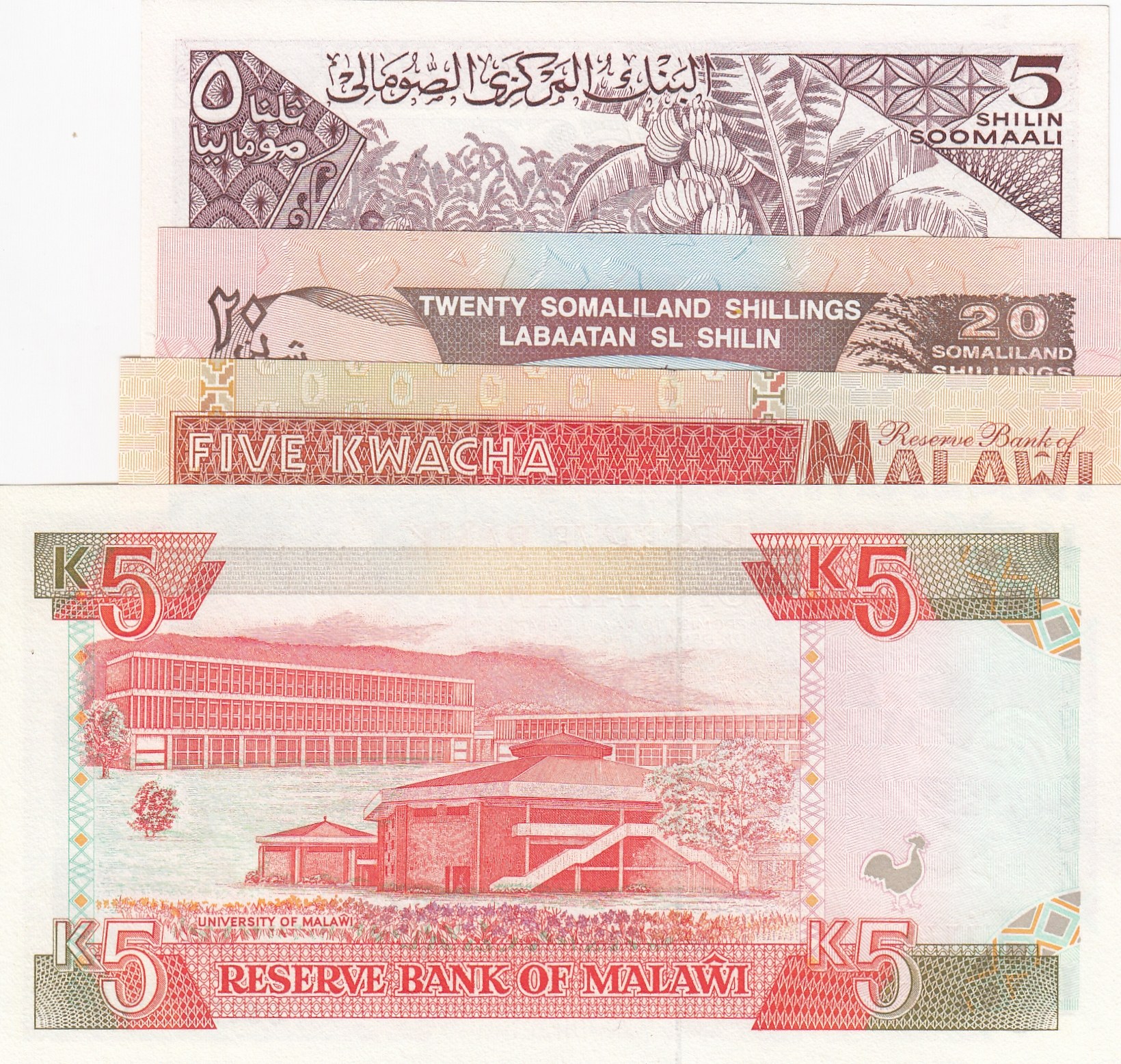 Malawi 5 Kwacha, Malawi 5 Kwacha, Soomaali 5 Shillings, Somaliland 20 Shillings
