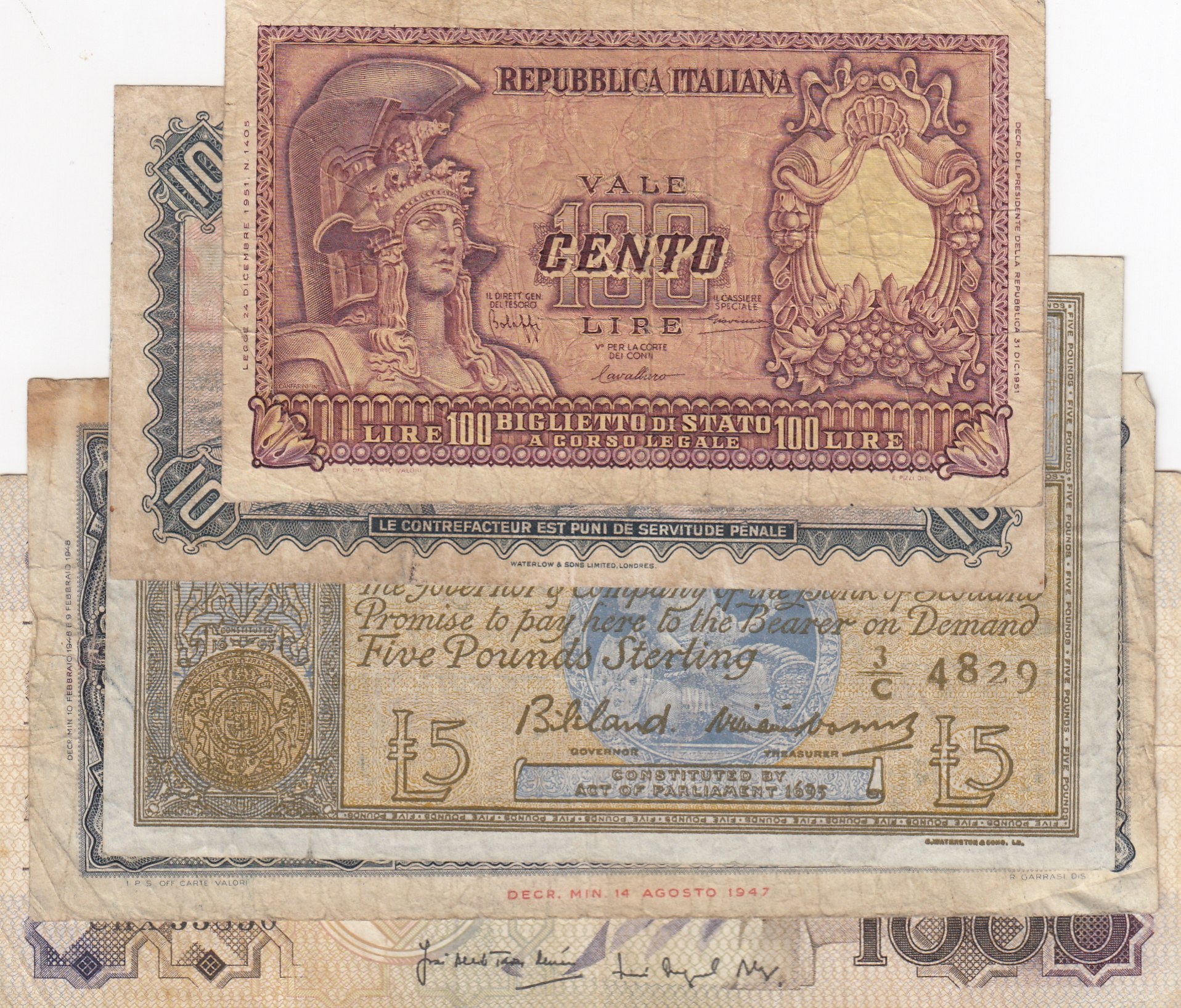 Italy 100 Lire, Belgium 10 Francs, Scotland 5 Pounds, Italy 1000 Lire, Portugal 1000 Escudos