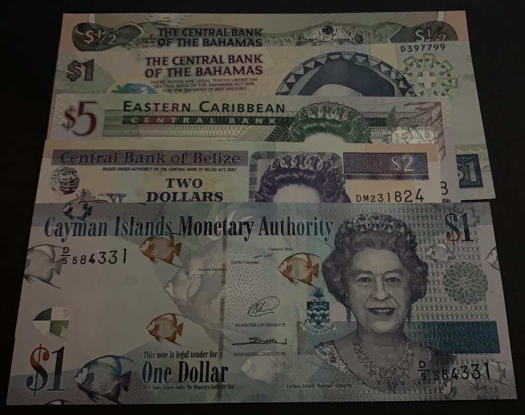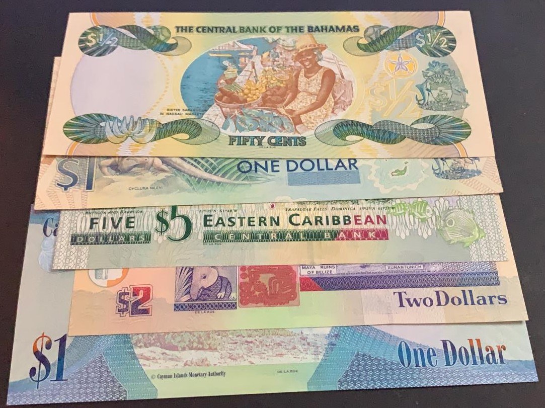 Bahamas, 50 Cents, Bahamas, 1 Dollar, Eastern Caribbean, 5 Dollars, Belize, 2 Dollars, Cayman Islands, 1 Dollar