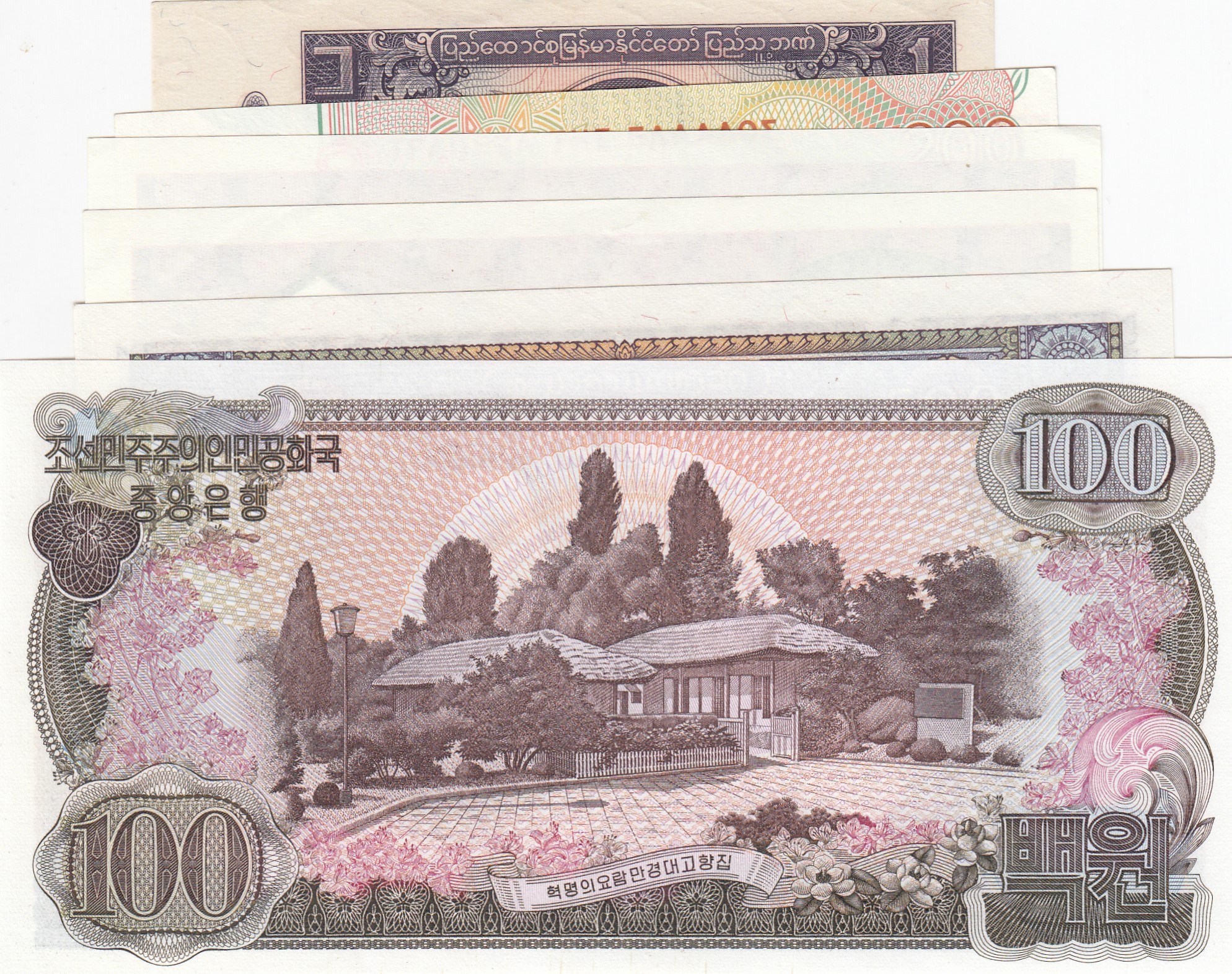 Greece, 200 Drahmai, Korean, 100 Won, Laos, 500 Kip, Burma, 1 Kyat, Tatarstan, 100 Rubles (2)