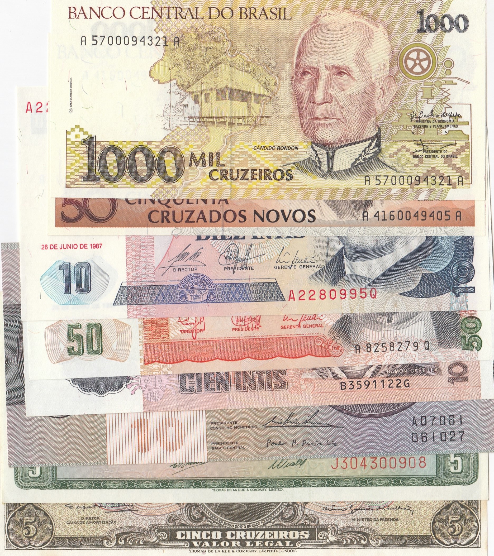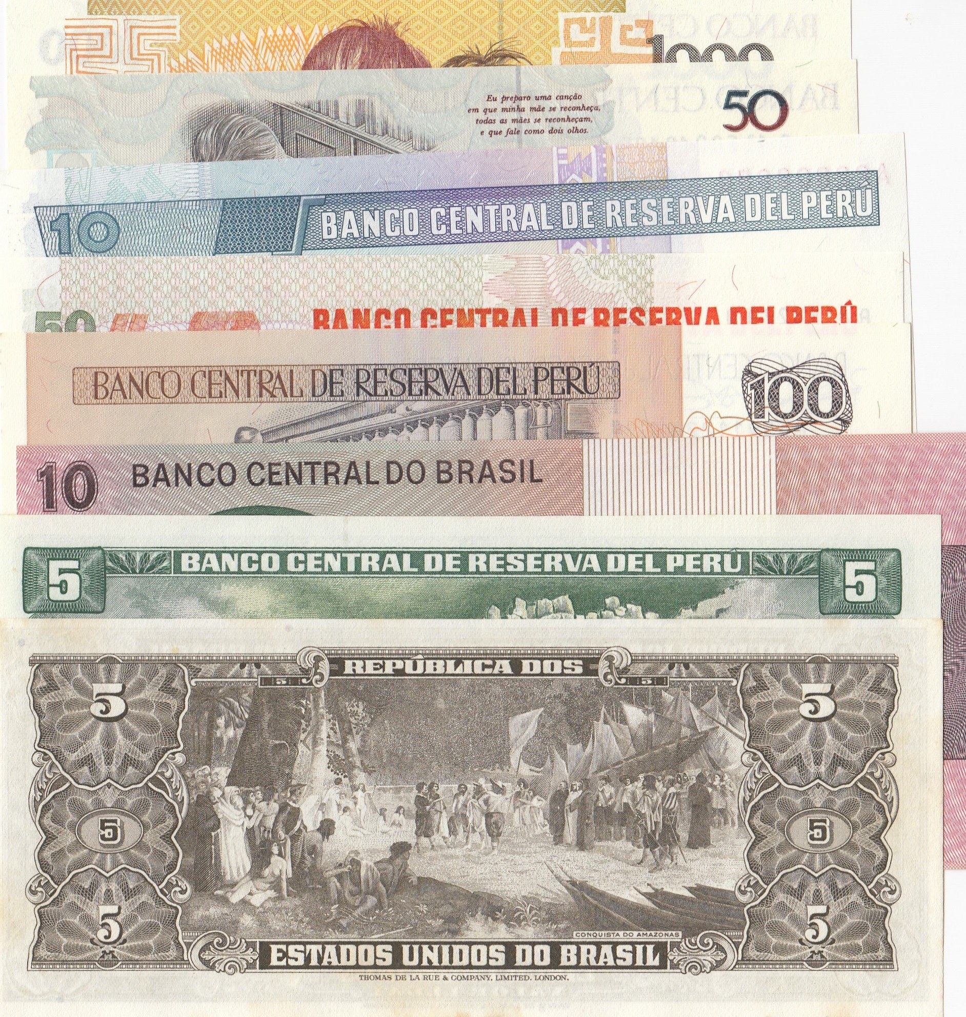 Peru, 5 De Oro, Peru, 10 Intis, Peru, 50 Intis, Peru, 100 Intis, Brasil, 5 Cruzeiros, Brasil,10 Cruzeiros,