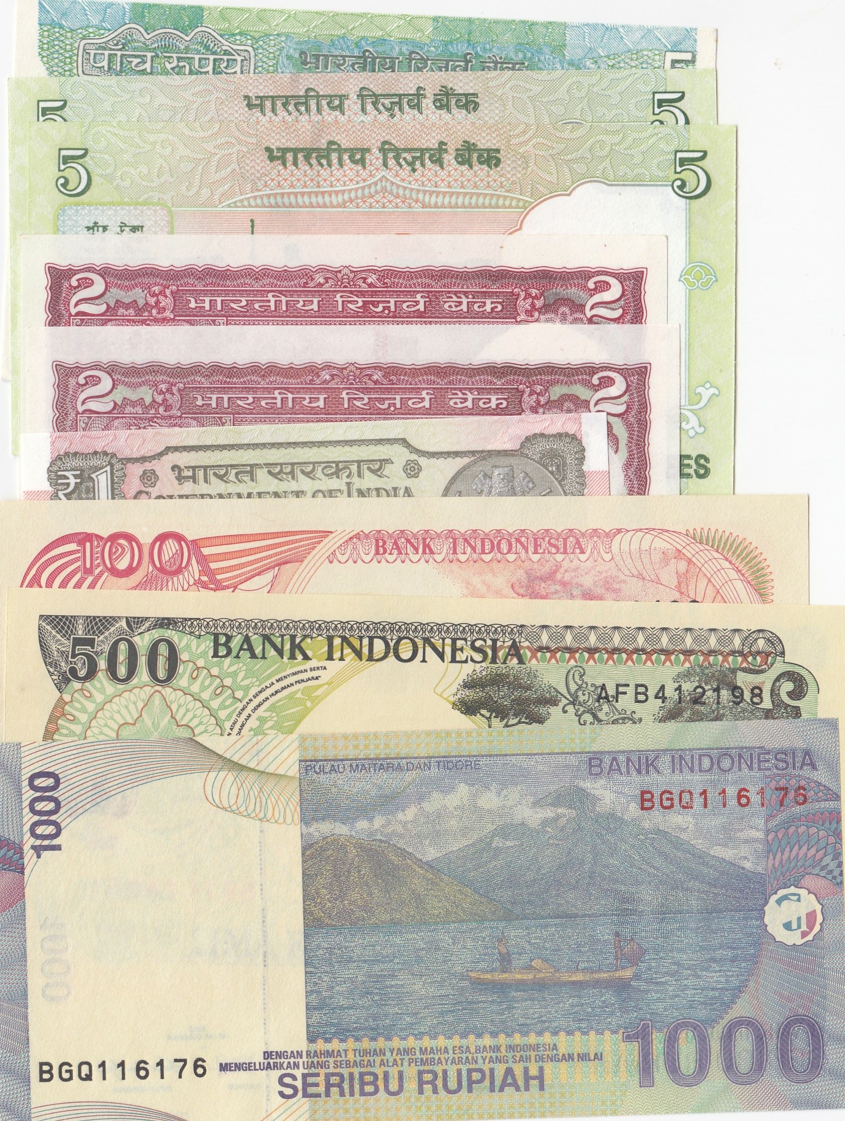 Indonesia, 100 Rupiah, Indonesia, 500 Rupiah, Indonesia, 1000 Rupiah, India, 1 Rupee, India, 2 Rupee (2), India, 5 Rupee (3)