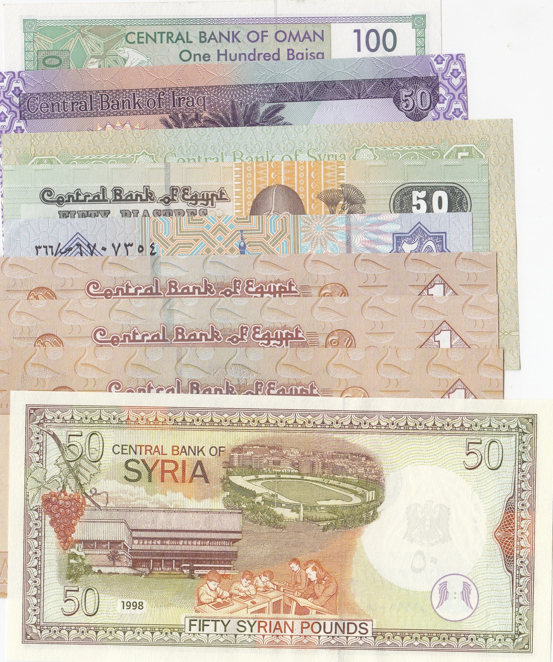 Egypt, 1 Pound (3), Egypt, 25 Piastres, Egypt, 50 Piastres, Iraq, 50 Dinars, Syria, 5 Pounds, Syria, 50 Pounds, Oman, 100 Baisa