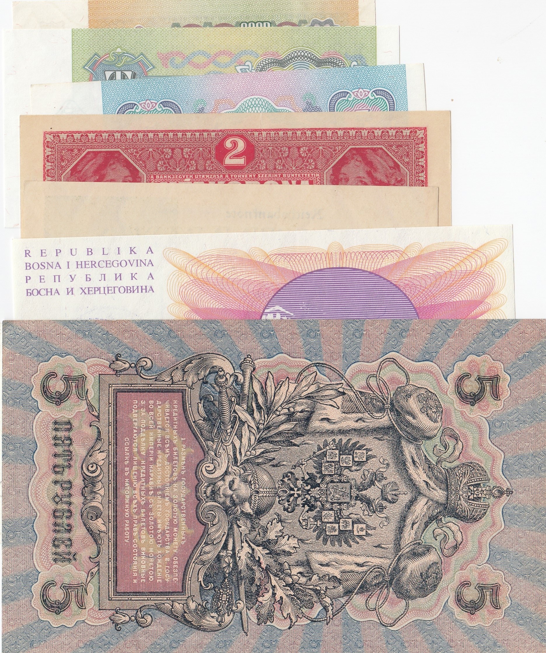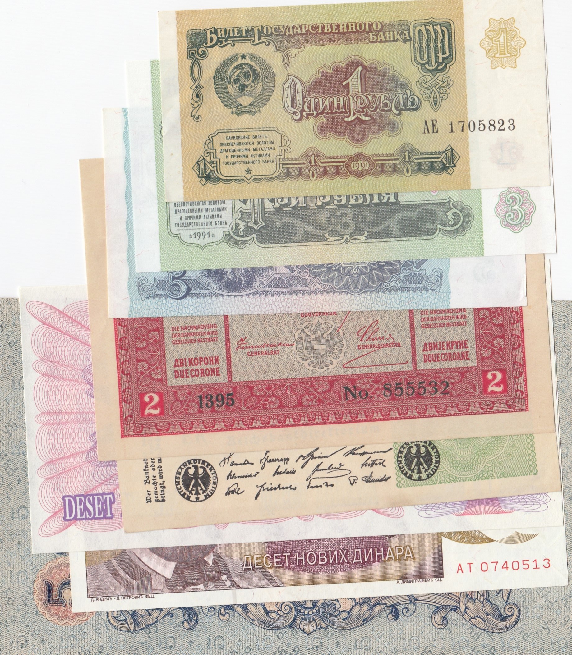 Austria, 2 Krona, 1917; Russia, 3 Ruble, 1991; Serbia, 10 Dinara, 1994; Germany, 5 Million Mark, 1923;