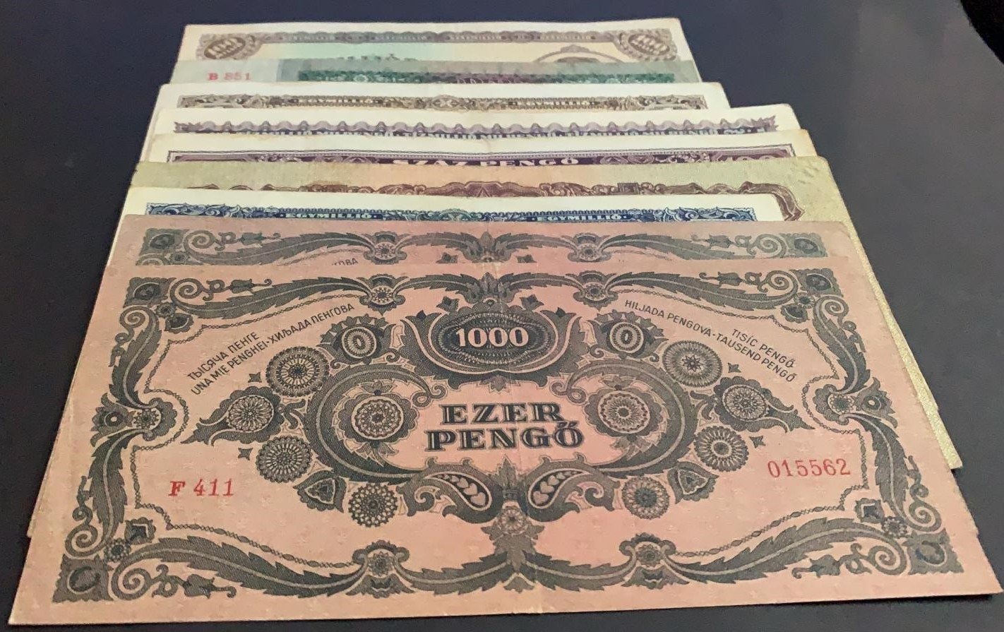 Hungary, 1000 Pengö, 1945, XF; 1000 Pengö, 1945, VF; 100.000.000 Pengö, 1946, AUNC; 10 Pengö, 1936, VF;