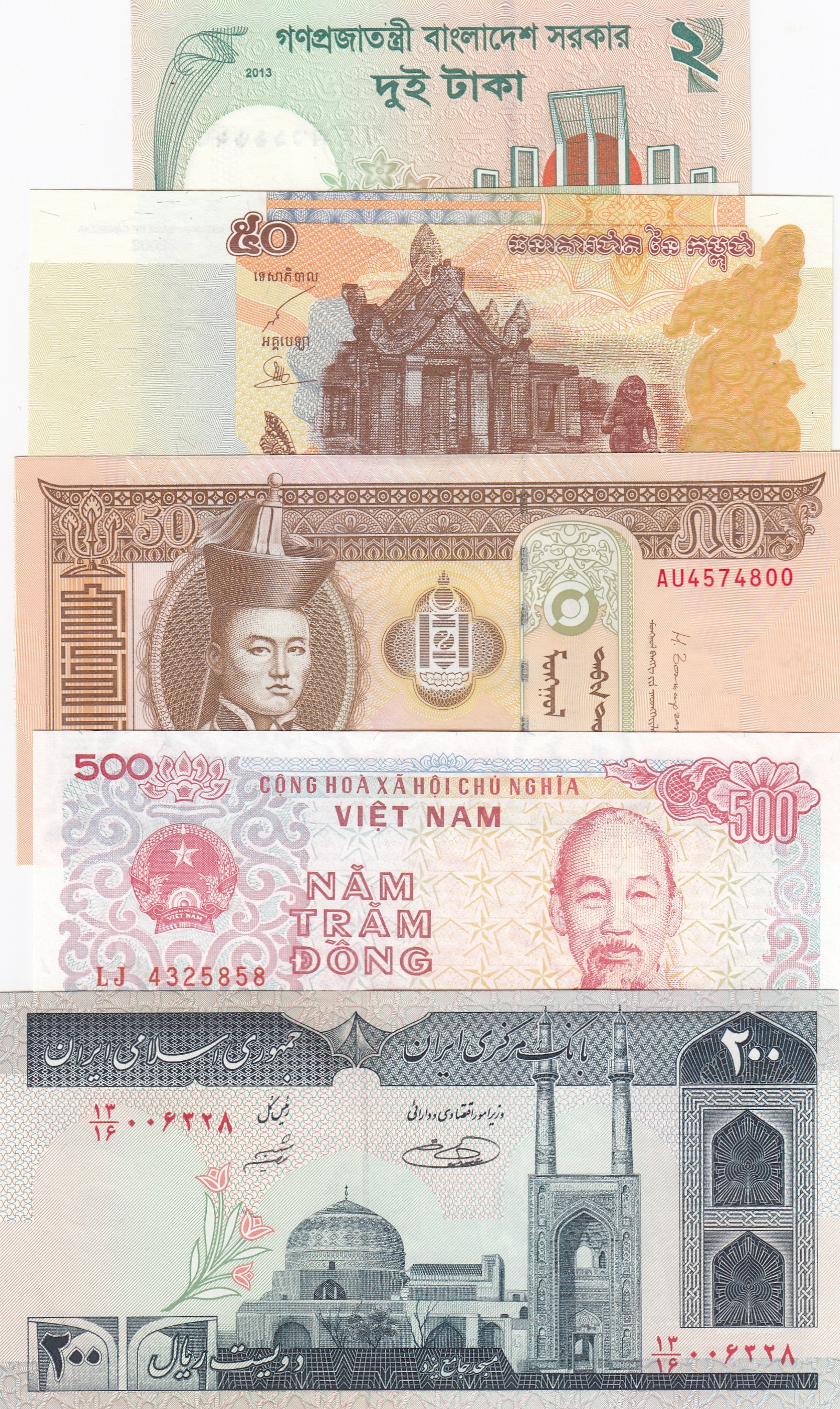 Cambodia 50 Riels, Bangladesh 2 Taka, Vietnam 1000 Dong and 500 Dong, İran 200 Rials, Mongalia 50 Tugrik, Tajikistan 50 Ruble, Belarus 100 Ruble, North Korea 5000 Won and Iraq 25 Dinar